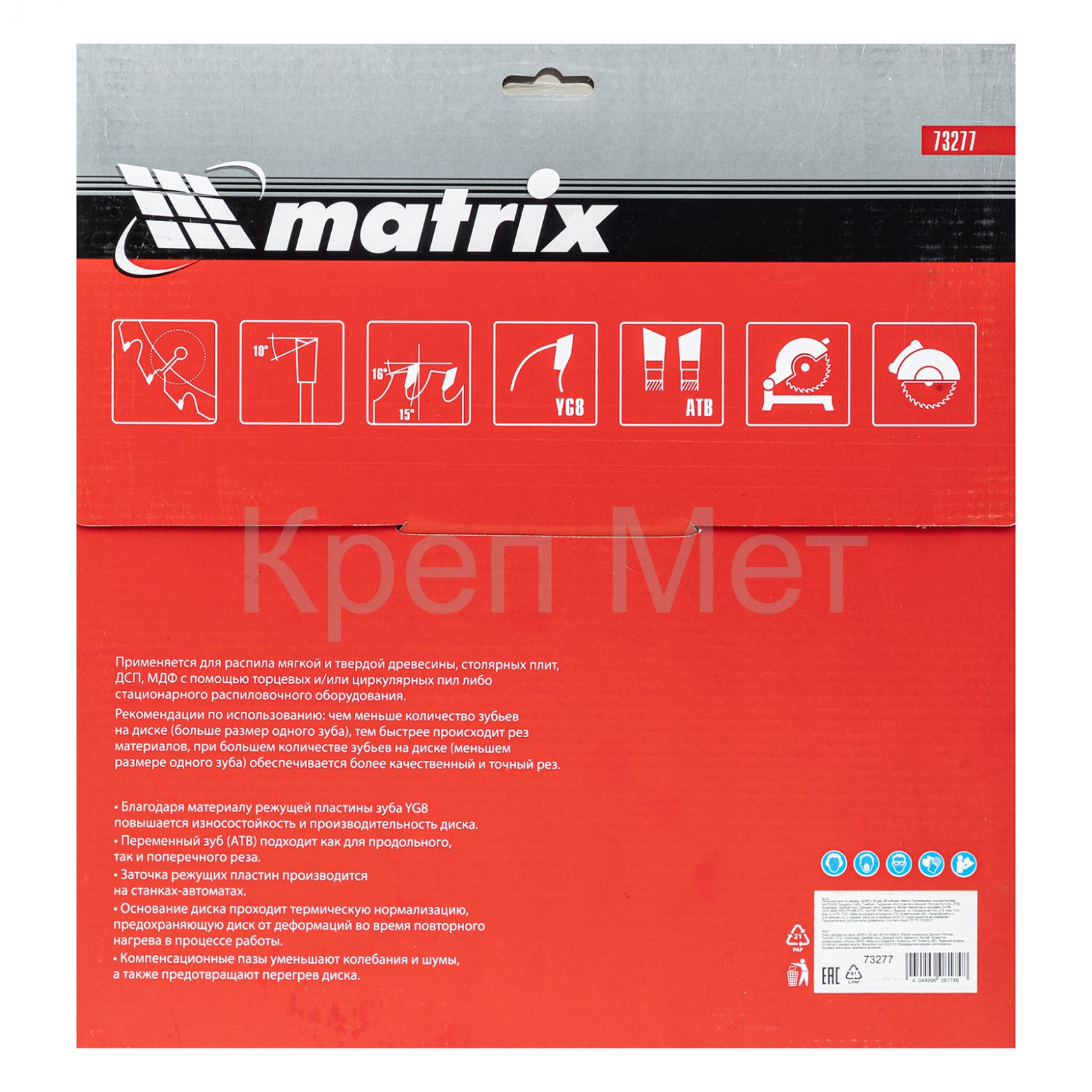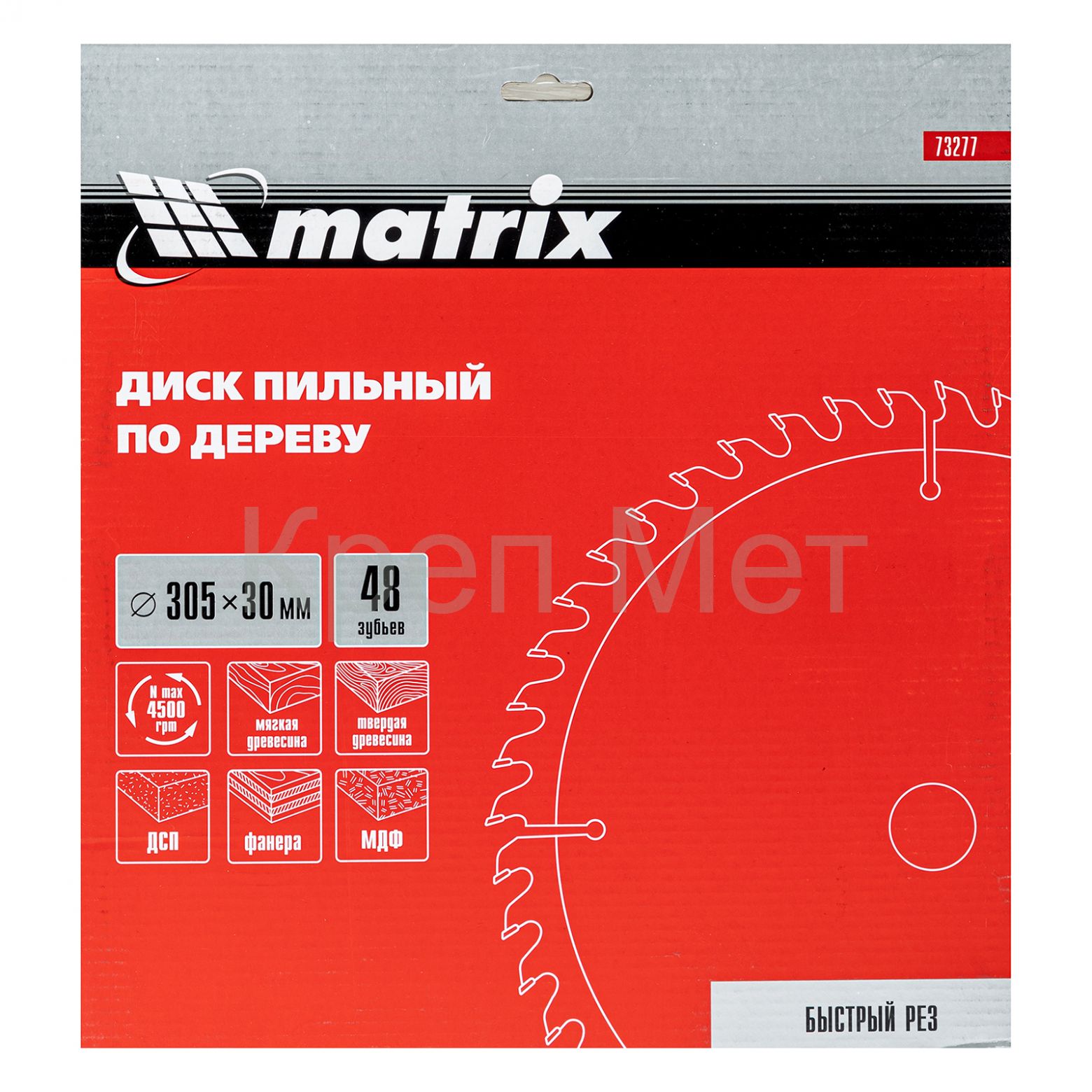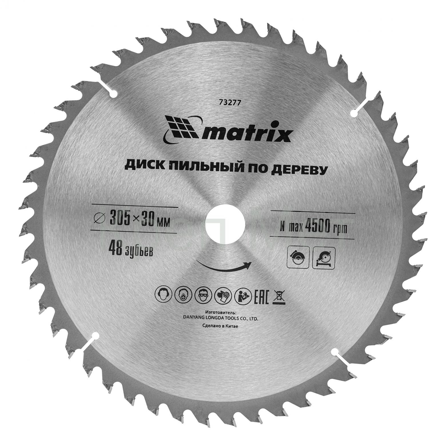 Пильный диск по дереву Matrix 73277 диаметром 305 х 30 мм, с 48 зубьями, — оснастка для циркулярных и торцовочных пил с соответствующим посадочным и внешним диаметром. Используется преимущественно для поперечного реза материалов из мягкой и твердой древесины, ДСП, ДВП, фанеры, столярных плит. Диск подходит для бытового и профессионального применения.