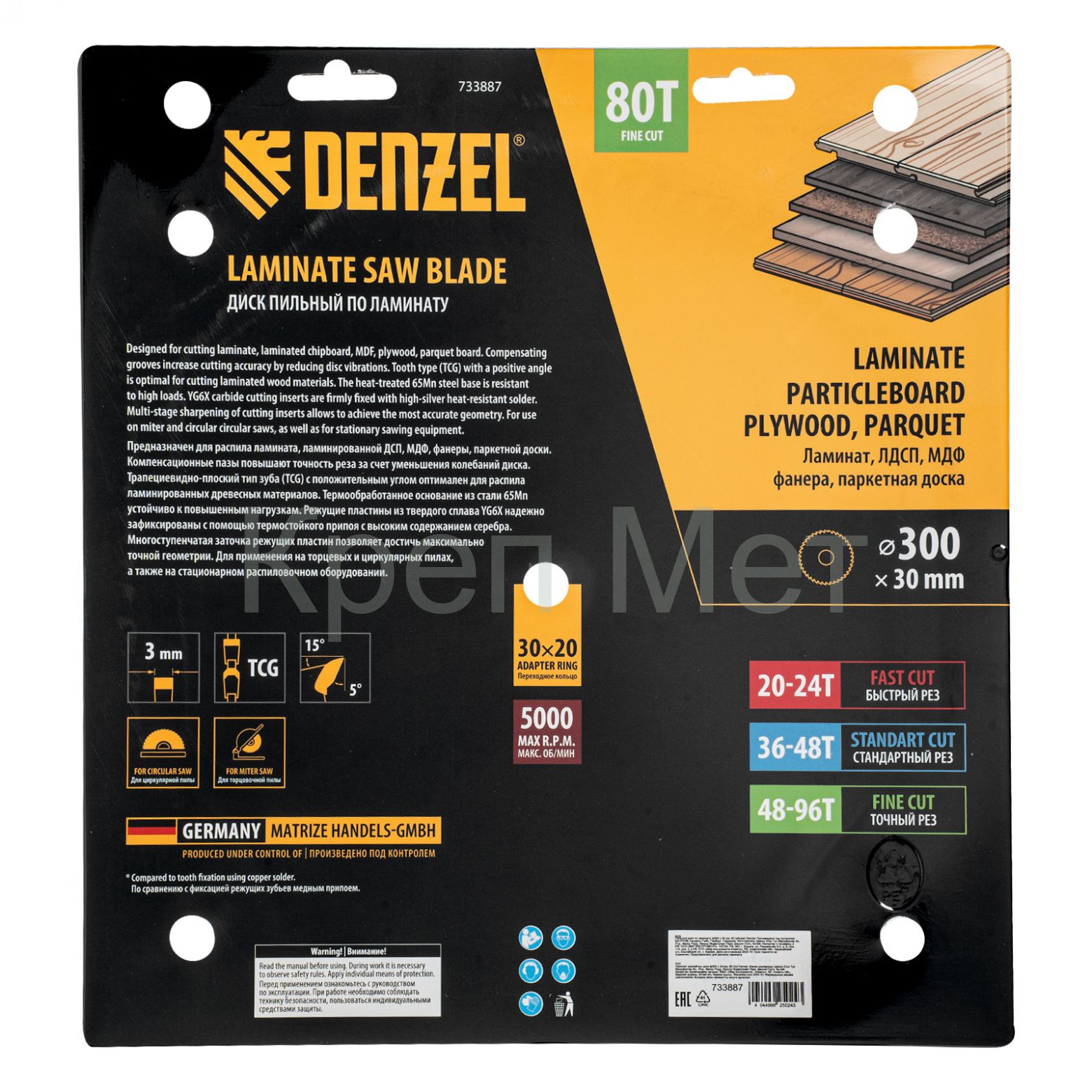 Пильный диск Denzel 733887 диаметром 300 x 30 мм, с 80 зубьями, используется для точного распиливания ламината, ЛДСП, МДФ, фанеры, паркетной доски. 80 мелких трапециевидно-плоских зубьев с положительным углом заточки позволяют эффективно решать поставленные задачи, обеспечивая максимально чистый рез. Диск устанавливается на циркулярную или торцовочную пилу, а также на распиловочный станок. Можно установить оснастку на инструмент с другим посадочным диаметром — для этого предусмотрено переходное кольцо 30/20 мм.