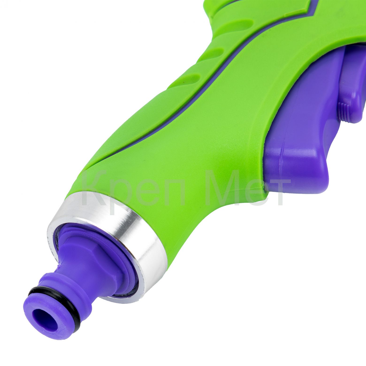 - 5-ступенчатый фиксатор курка позволяет выбрать оптимальный режим распыления (жесткая струя, режимы «туман» и конусный), а также осуществлять непрерывный полив и полное прекращение водоподачи.