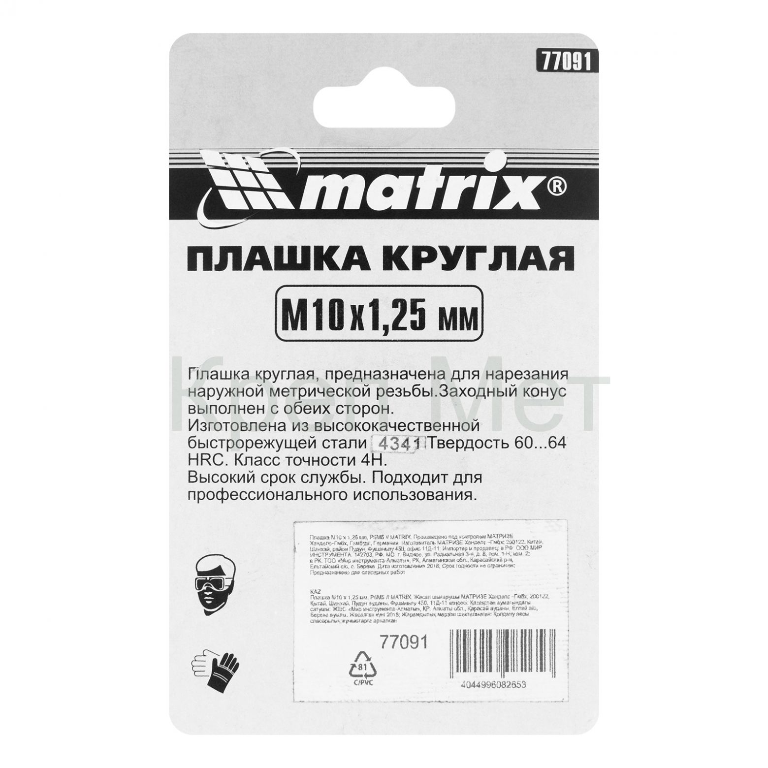 Плашка Matrix 77091 типоразмера М10 х 1,25 мм, из стали HSS, — резьбонарезной инструмент, предназначенный для восстановления старой или создания новой внешней метрической резьбы на металлических деталях. Для эксплуатации плашки не требуются особые навыки, что позволяет выполнять слесарные и монтажные работы в домашних условиях. Цельный корпус обеспечивает жесткое сцепление с деталью для получения высококачественной резьбы.