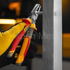Комбинированные плоскогубцы Denzel 17086 длиной 180 мм, с диэлектрическими трехкомпонентными рукоятками, выдерживающими до 1000 В, предназначены для выполнения работ с токопроводящими элементами. С их помощью можно захватить или согнуть мелкие и крупные детали, перекусить проволоку или перерезать провод. Инструмент подходит для работы с мягкой проволокой (алюминиевой, медной, с пределом прочности 220 Н/мм2) диаметром до 5,2 мм, проволокой средней жесткости и гвоздями (750 Н/мм2) диаметром до 3,4 мм, и жесткой (предел прочности 1800 Н/мм2) толщиной до 2,2 мм. Также плоскогубцы можно использовать в качестве гаечного ключа. Инструмент незаменим для проведения слесарных и монтажных работ с различными компонентами и материалами. Внимание: перед началом работ следует отключить напряжение!