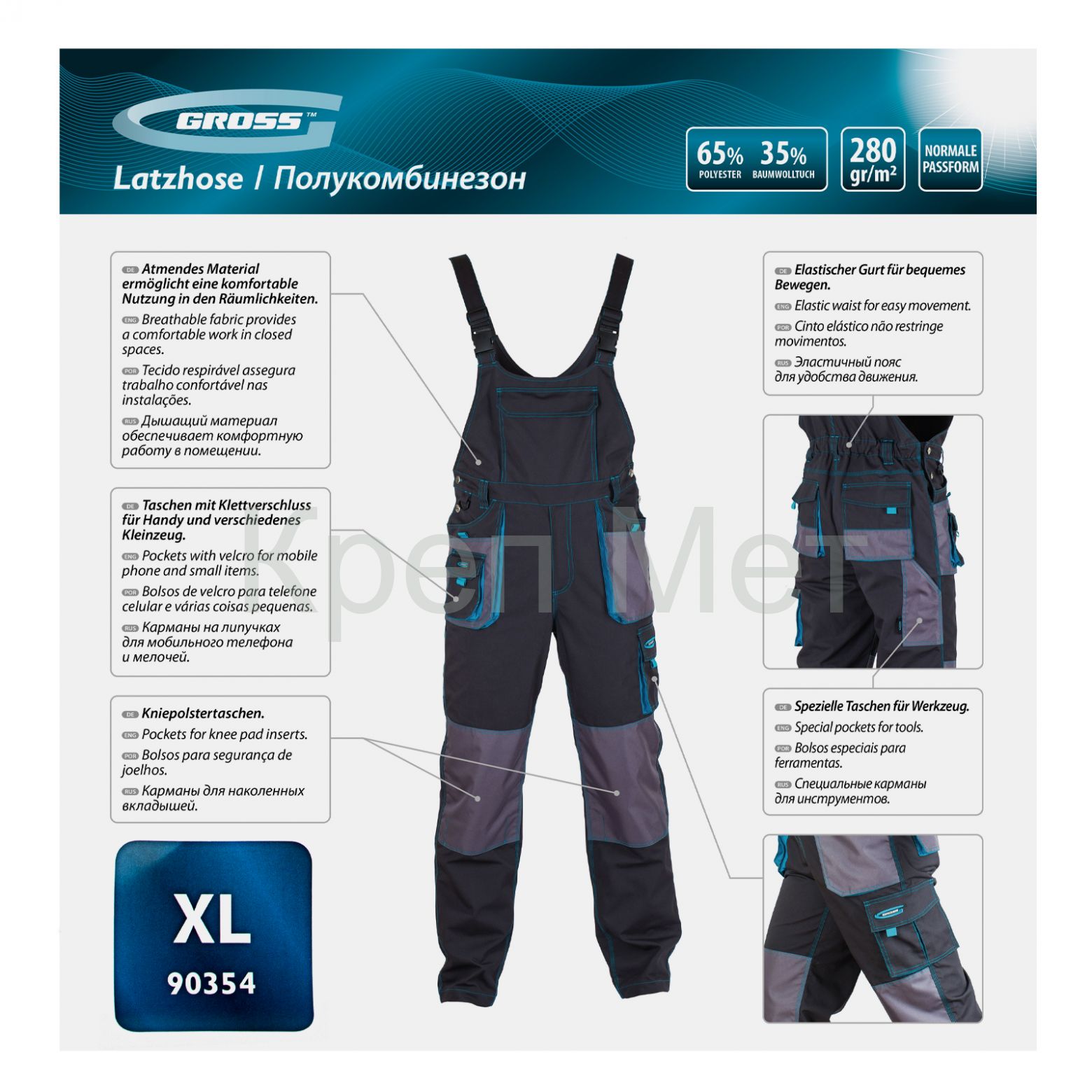 Полукомбинезон Gross 90354 размера XL рассчитан на рост 184-188 см и предназначен для защиты рабочего от общих производственных загрязнений и механических повреждений (истираний). Может применяться в отапливаемых помещениях или на улице в теплое время года. Изготовлен из смесовой ткани, содержащей 35% хлопка, что обеспечивает ей дышащие свойства. Полиэстер в составе материала повышает износостойкость спецодежды. Полукомбинезон необходим строителям, электрикам, садовникам, сотрудникам автосервисов, будет полезен и рабочим других специальностей.