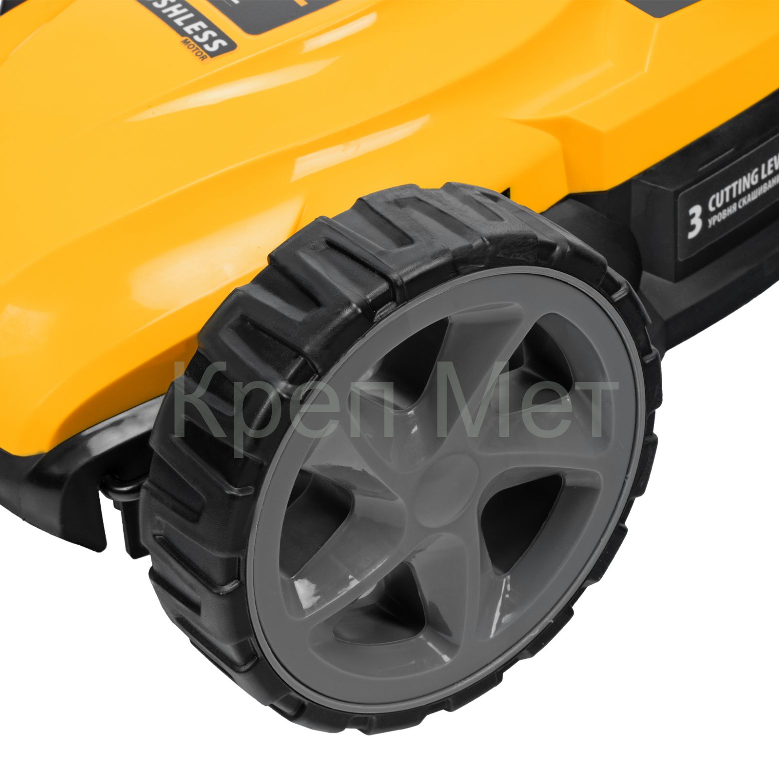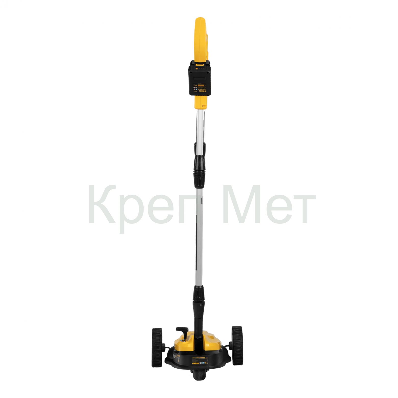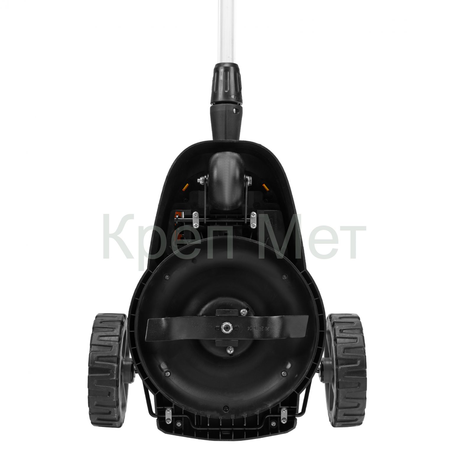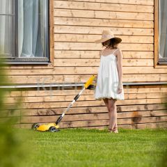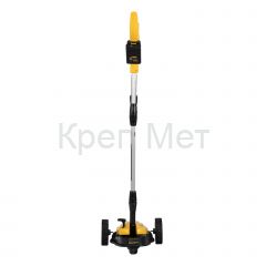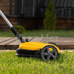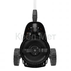 - Мобильность — благодаря небольшому весу 3,7 кг (без АКБ), двум большим и одному малому сферическому колесу технику легко перемещать, косить траву удобно даже в узких и труднодоступных местах.