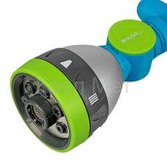 - 7 режимов полива — конусное, вертикальное и горизонтальное распыление, жесткая струя, веер, душ, туман.