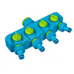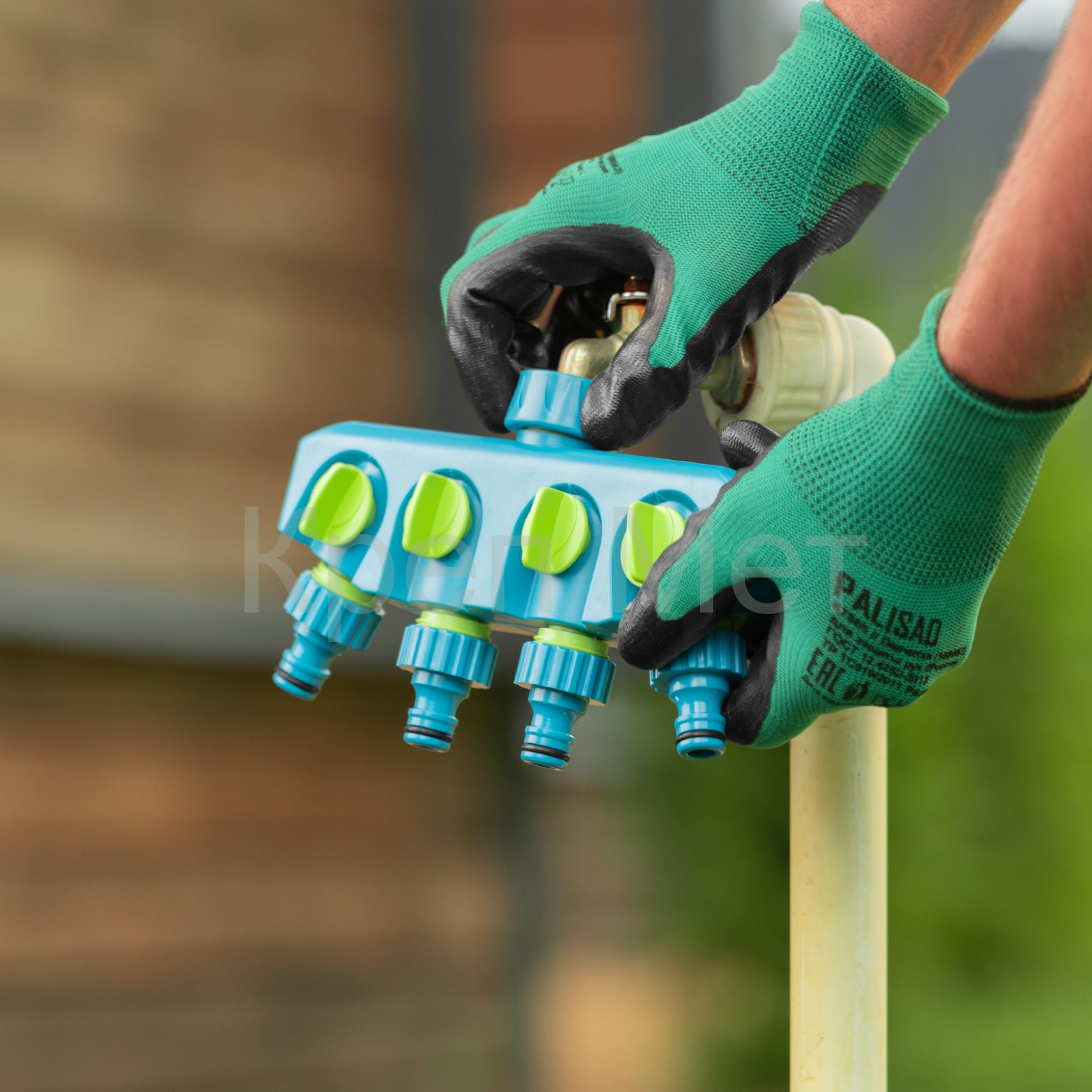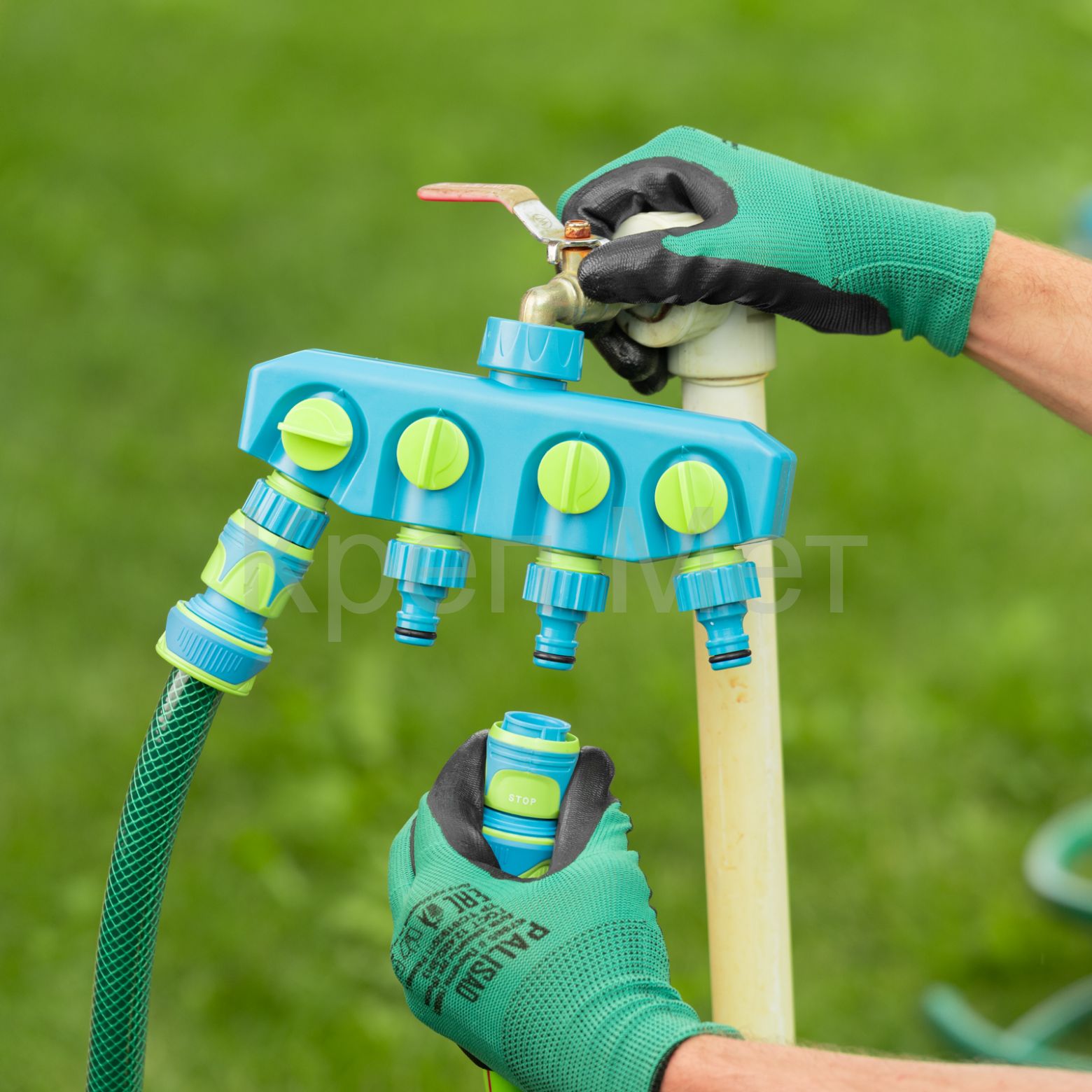 Четырехканальный пластиковый разветвитель Palisad LUXE 65787 с внутренней резьбой 3/4"-1" позволяет разделить водоразборную магистраль на 4 линии, значительно увеличив площадь полива. Монтируется на кран или отвод с внешней резьбой. Пригодится для организации системы полива на дачном участке.