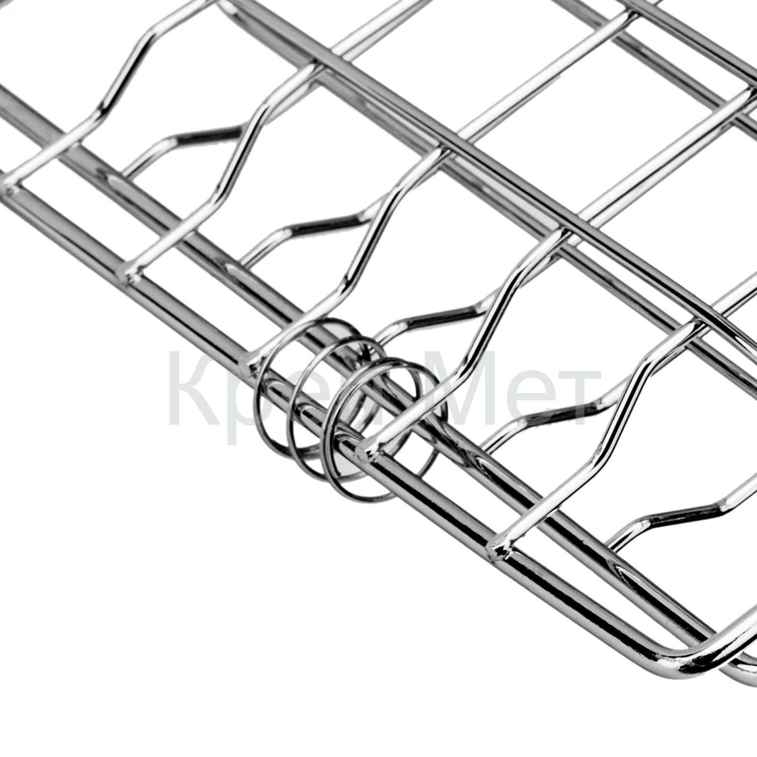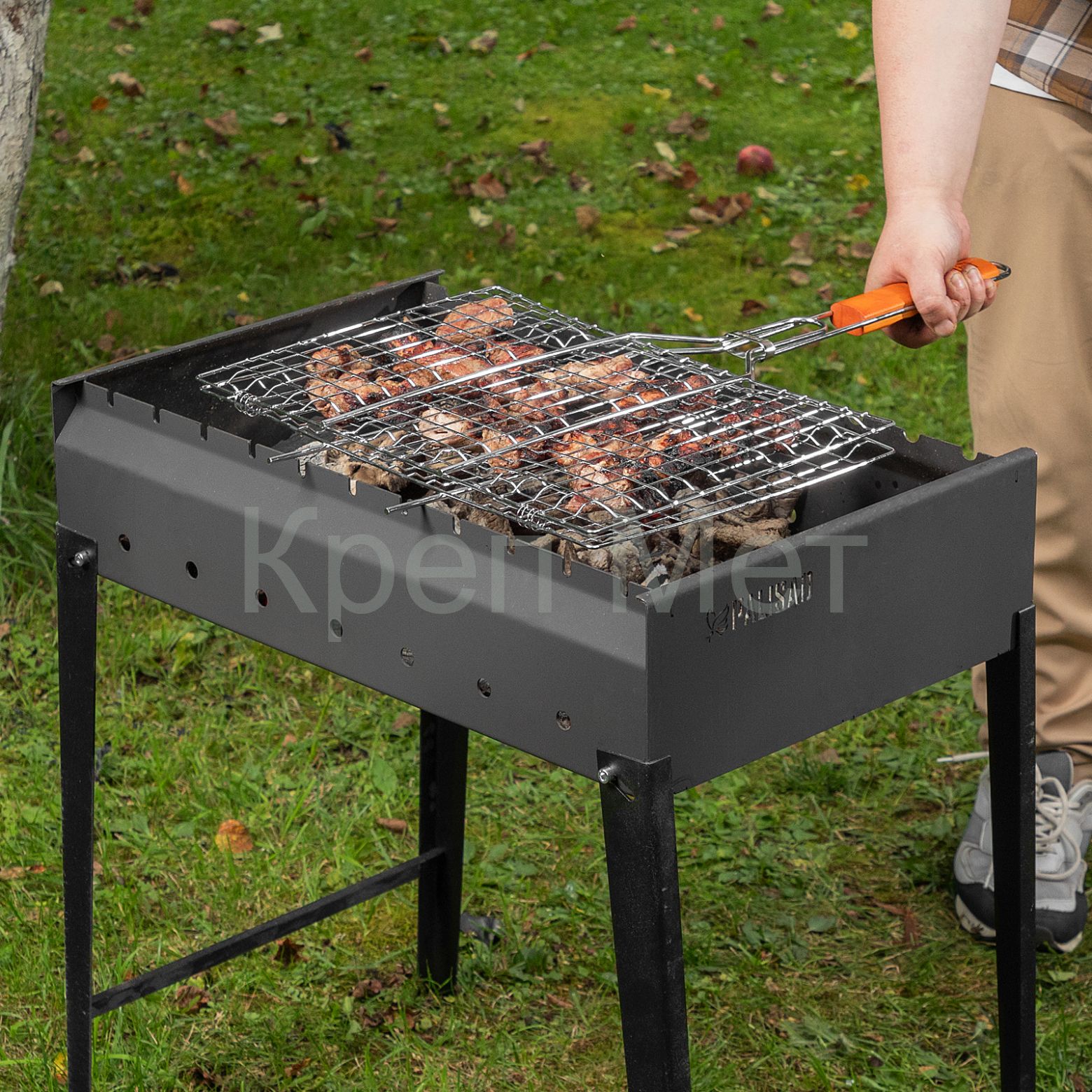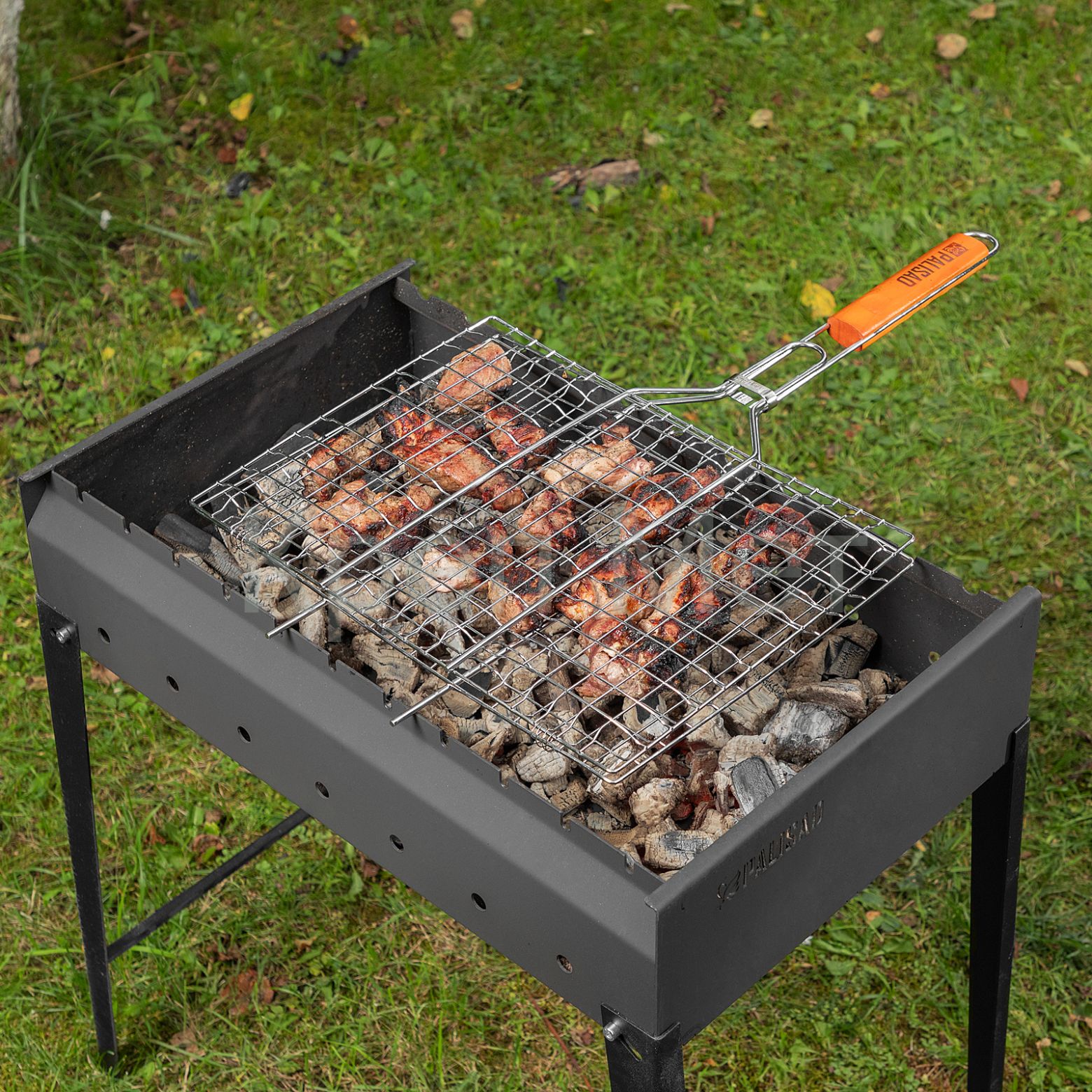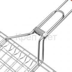 - Решетка оборудована увеличенными опорными стержнями, за счет чего прочно фиксируется на мангале, а при готовке ее площадь используется полностью.