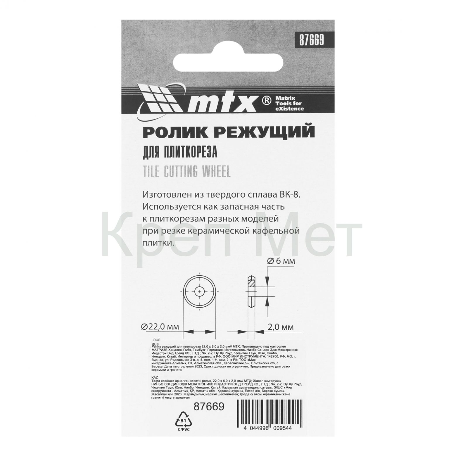Режущий ролик MTX 87669 размером 22,0 х 6,0 х 2,0 мм — сменный элемент для плиткорезов MTX 87653, 87656 и 87658. Благодаря качественной заточке быстро и точно режет керамическую плитку любого типа.