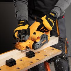 - Комфортная работа — направление выброса стружки переключается одним рычагом, параллельная направляющая и ограничитель глубины выборки четверти помогают точно вести рубанок.