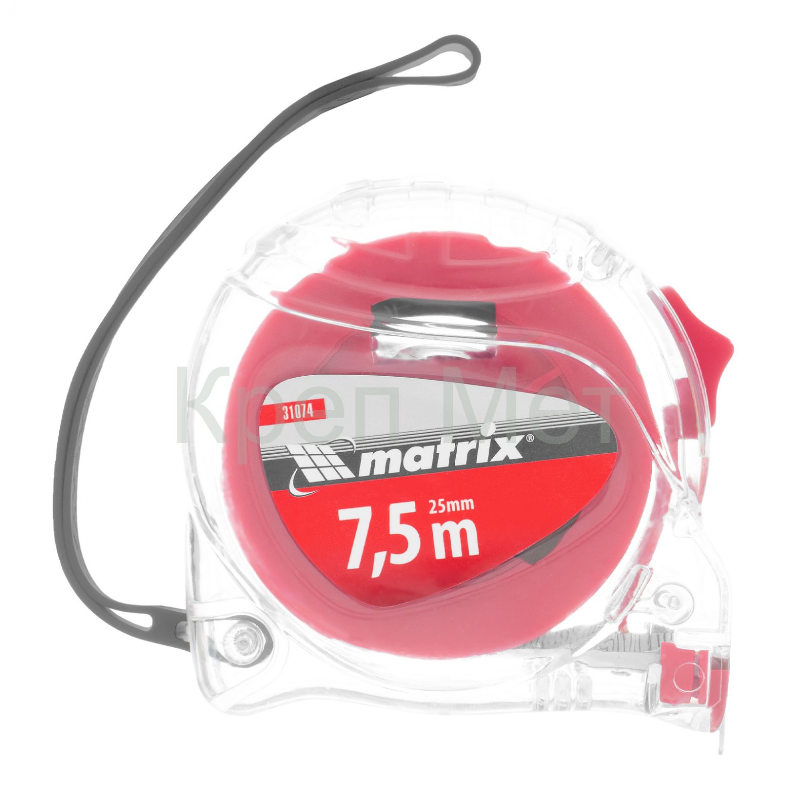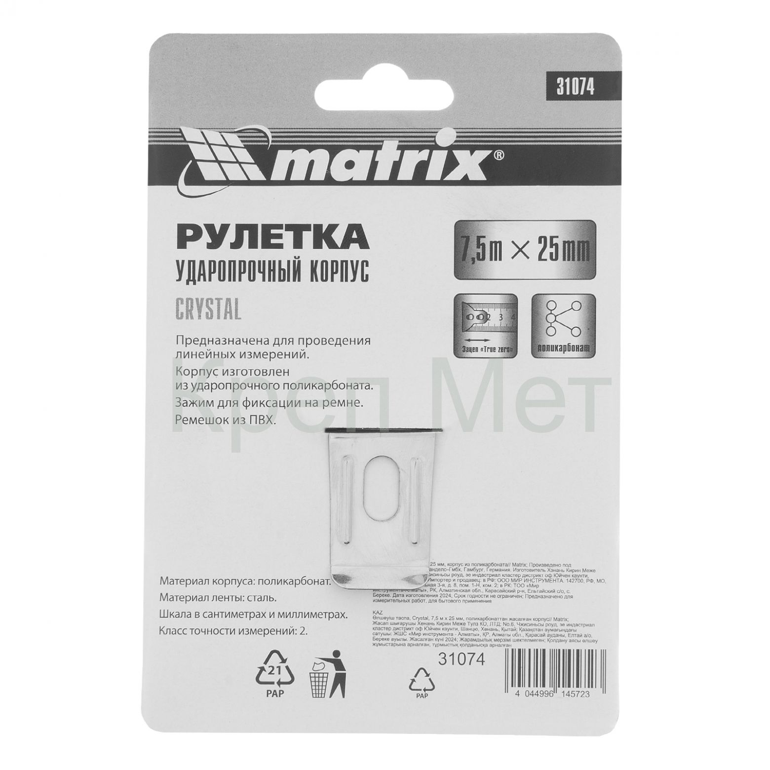 Рулетка Matrix Crystal 31074 с лентой длиной 7,5 м и шириной 25 мм, в корпусе из поликарбоната, — измерительный инструмент, использующийся как в профессиональной сфере, так и в быту. Отличительной особенностью модели является корпус из высокопрочного поликарбоната, характеризующийся повышенной устойчивостью к механическим повреждениям.
