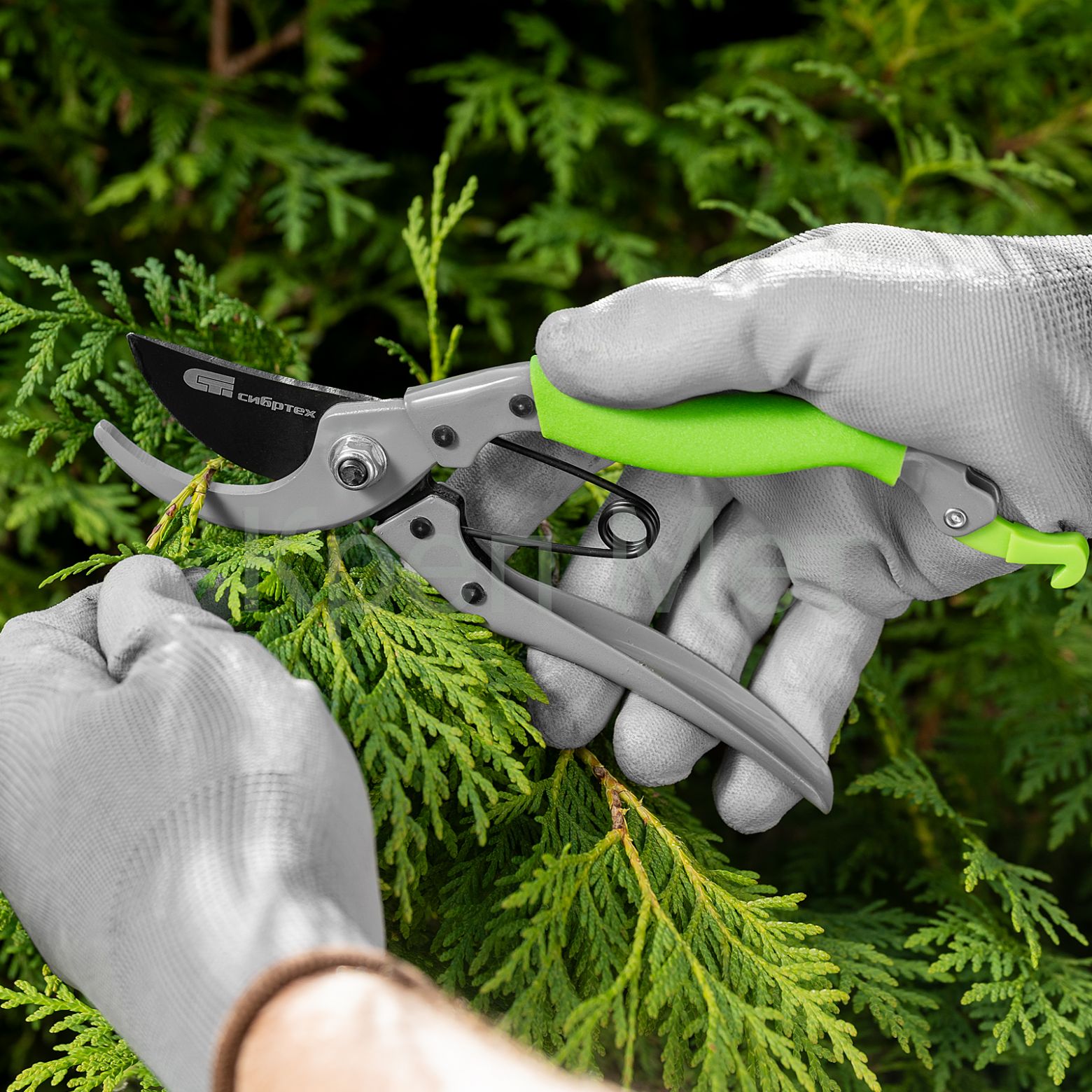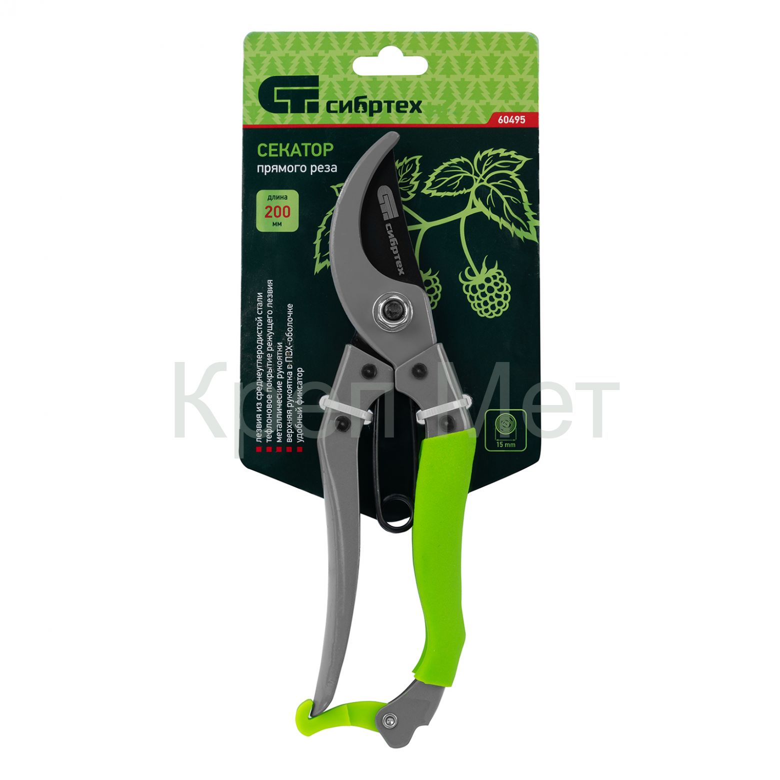 Секатор прямого реза Сибртех 60495 длиной 200 мм, с металлическим рукоятками, верхняя в ПВХ-оболочке, используется для ухода за садом и огородом. Предназначен для обрезания живых веток диаметром до 15 мм. Лезвие с прецизионной заточкой двигается в плоскости, параллельной опорному лезвию, чисто обрезая ветки и нанося минимальные повреждения растениям. Плотность примыкания лезвий регулируется — для этого предусмотрен винт.