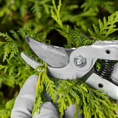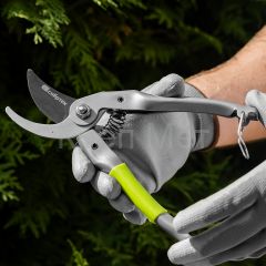 - Высокий ресурс — режущее лезвие прошло индукционную закалку, а кромка имеет прецизионную заточку, поэтому секатор долго сохраняет рабочие свойства.