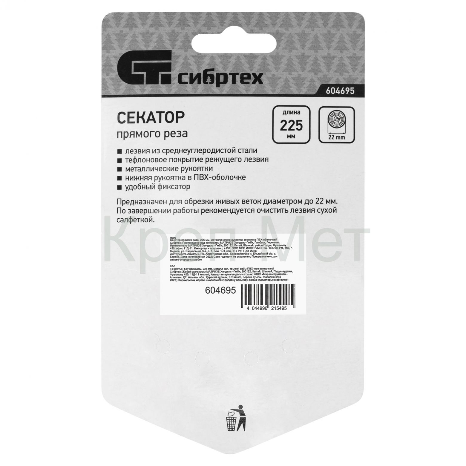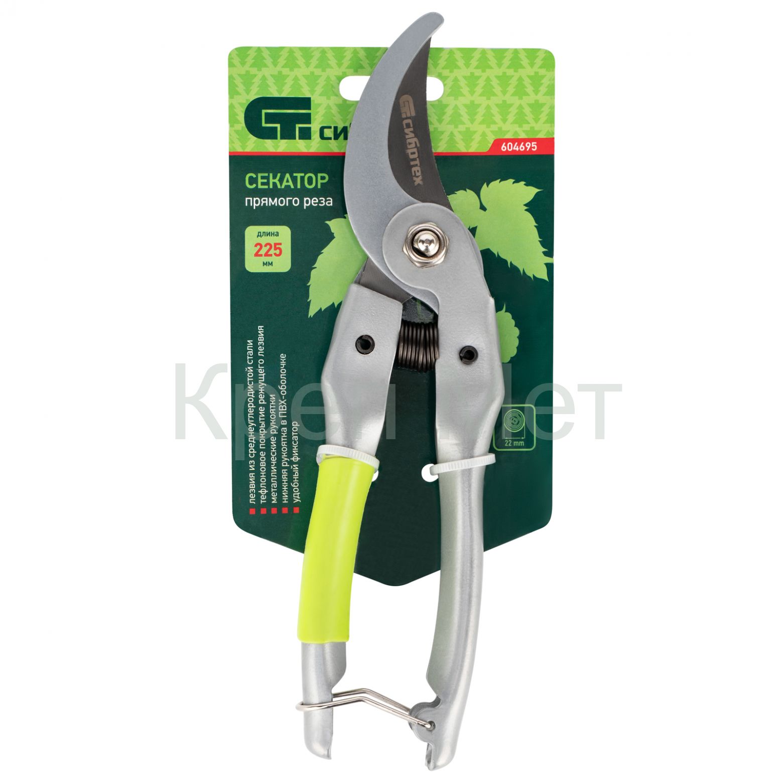 - Секатор прямого реза, 225 мм, металлические рукоятки, нижняя в ПВХ-оболочке Сибртех