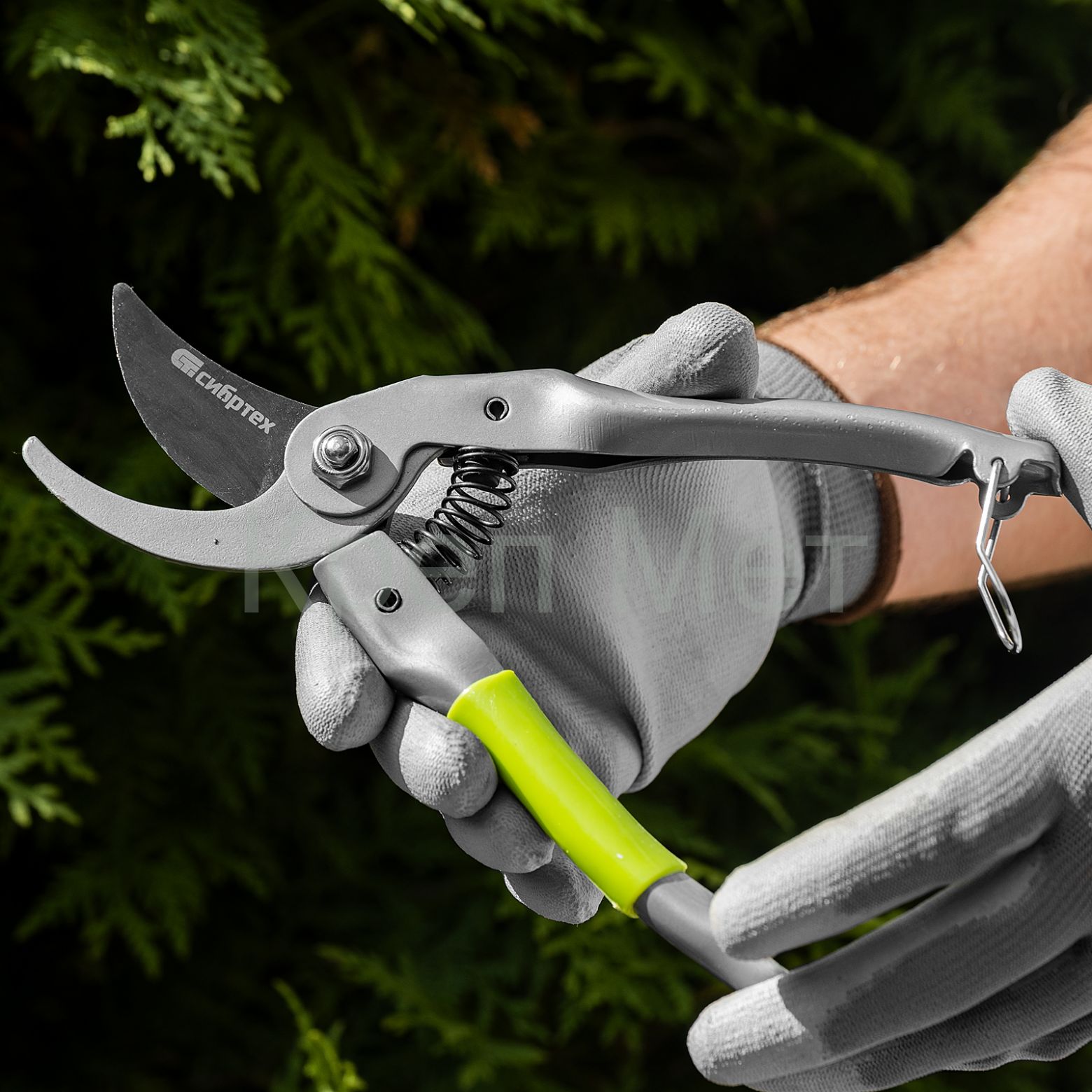 - Безопасность пользователя — металлическая скоба фиксирует рукоятки в сжатом состоянии, что исключает риск случайного раскрытия лезвий во время хранения или транспортировки.