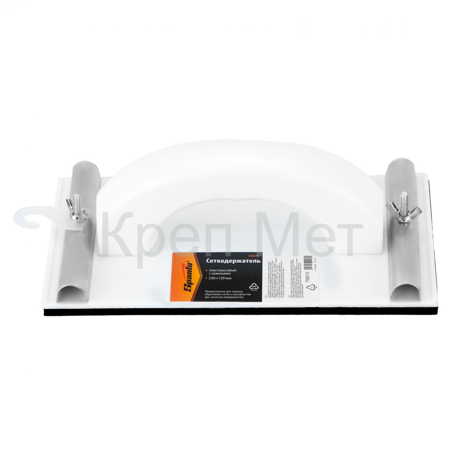 Пластиковый сеткодержатель Sparta 758475 с подошвой 230 х 105 мм, с зажимами, используется для ручного шлифования деревянных, шпатлеванных, металлических, пластмассовых и прочих твердых поверхностей. Сеткодержатель фиксирует абразивную стеклосетку или шлифлист и позволяет удалять старые отделочные покрытия, подготавливать поверхность под покраску, а также выполнять чистовую обработку.