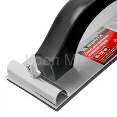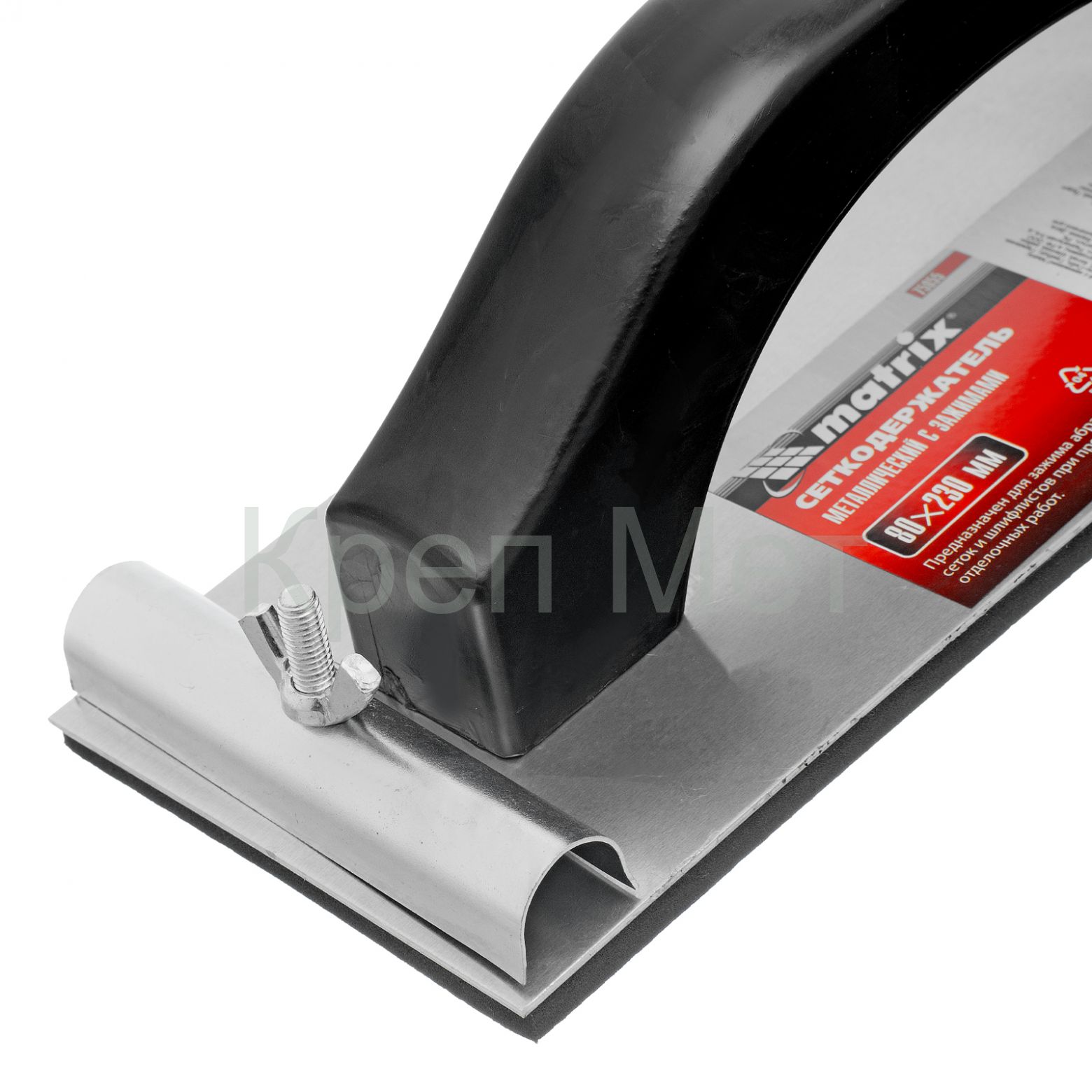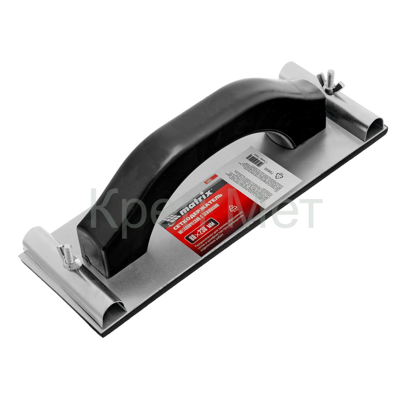 Металлический сеткодержатель Matrix 75855 с подошвой 80 х 230 мм, с зажимами, используется для ручного шлифования деревянных, шпатлеванных, металлических, пластмассовых и прочих твердых поверхностей. Сеткодержатель фиксирует абразивную стеклосетку или шлифлист и позволяет удалять старые отделочные покрытия, подготавливать поверхность под покраску, а также выполнять чистовую обработку.