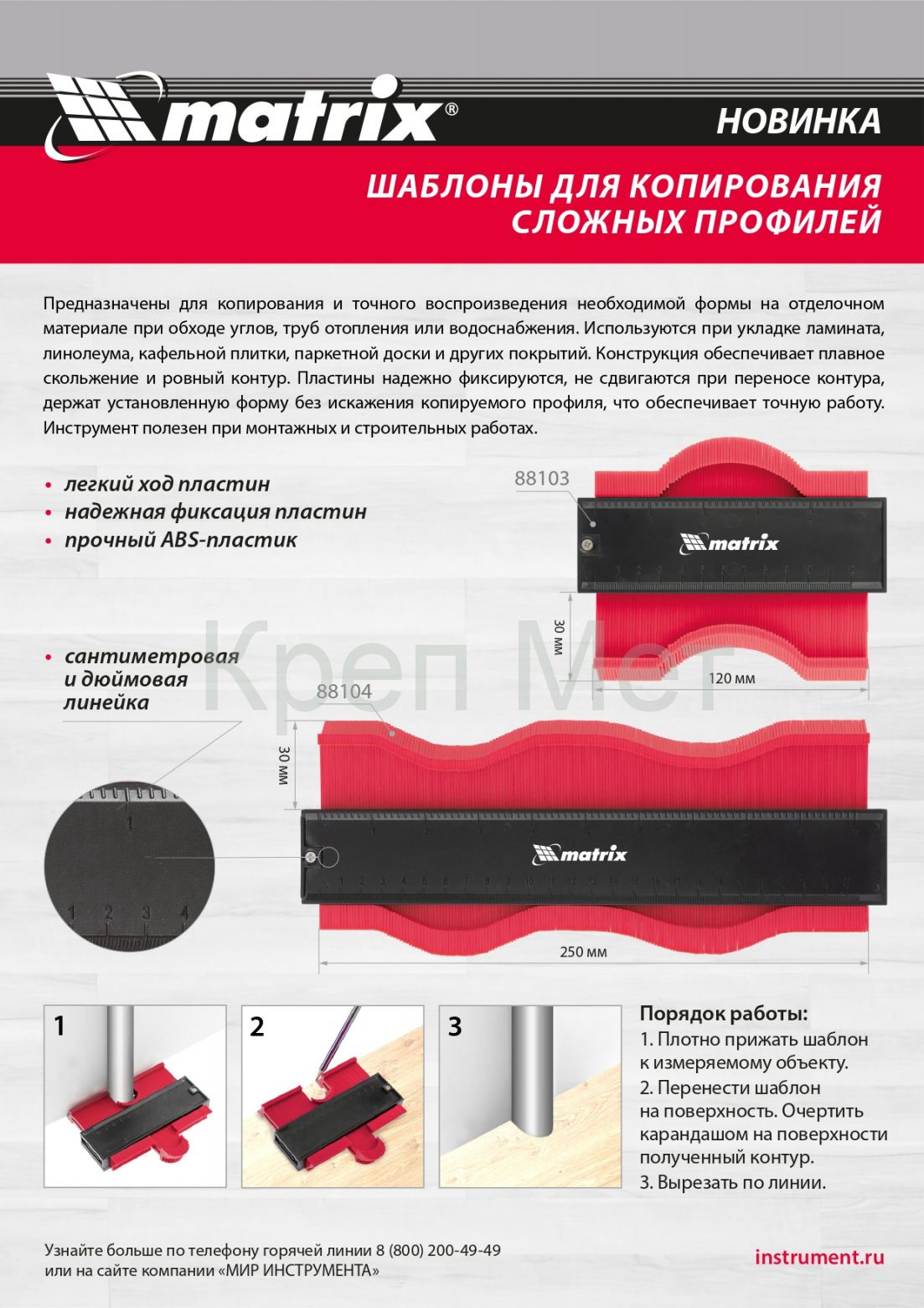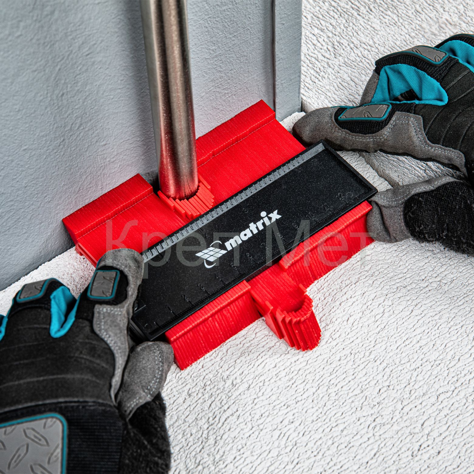 Пластиковый шаблон для копирования профиля Matrix 88103 предназначен для копирования и переноса контуров различных форм. Шаблон необходим для точной подрезки отделочных материалов (ламината, линолеума, кафельной плитки, гипсокартона и др.) при обходе труб водоснабжения, углов и других рельефных препятствий. Перенос контуров осуществляется при помощи выдвижных пластиковых пластин. Шаблон оснащен измерительной шкалой длиной 12 см.