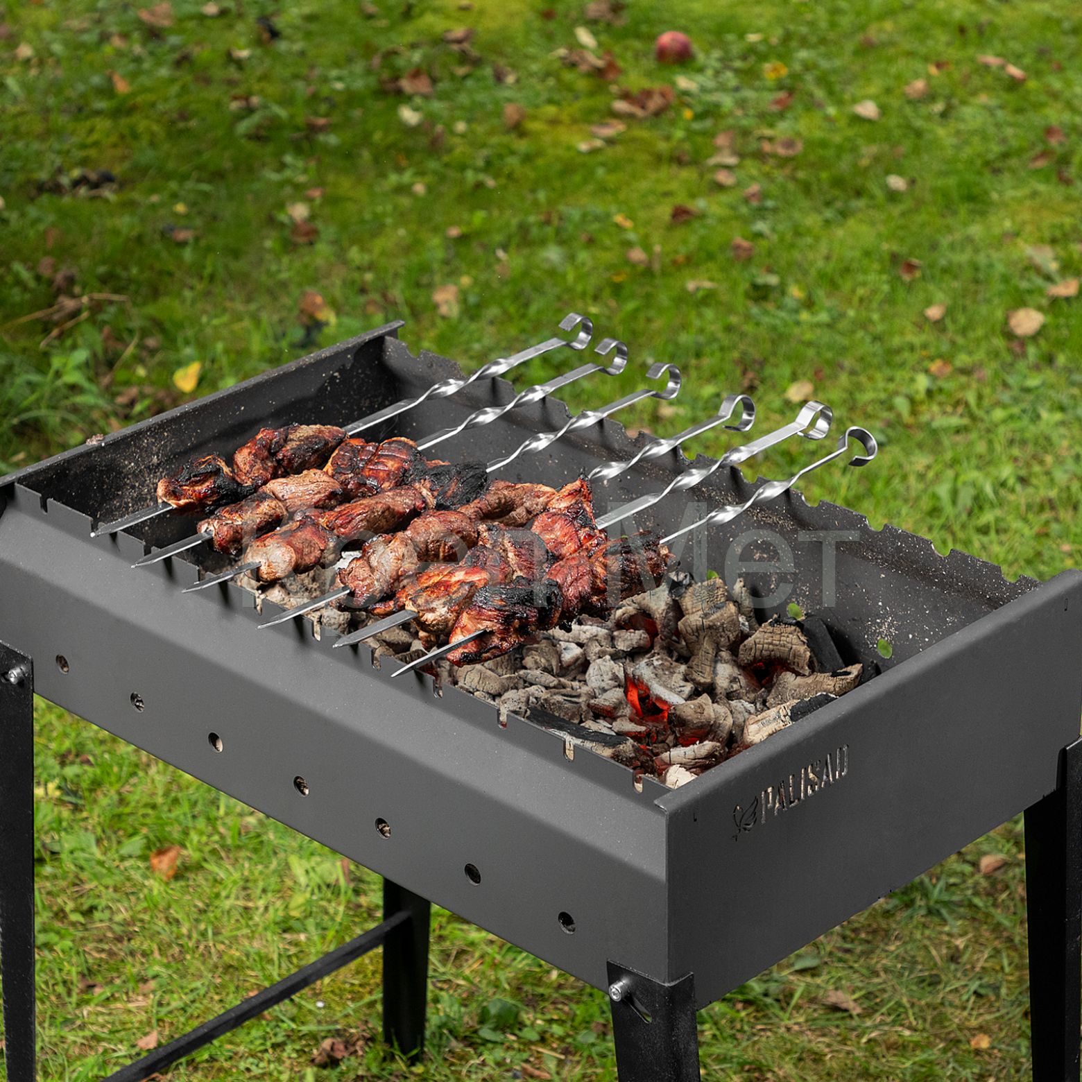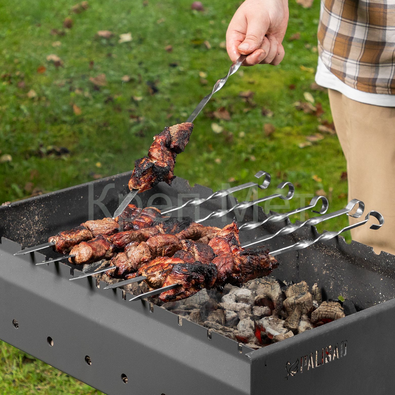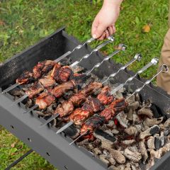 - Прочность и долговечность — упругие шампуры толщиной 1,5 мм не деформируются под тяжестью продуктов.