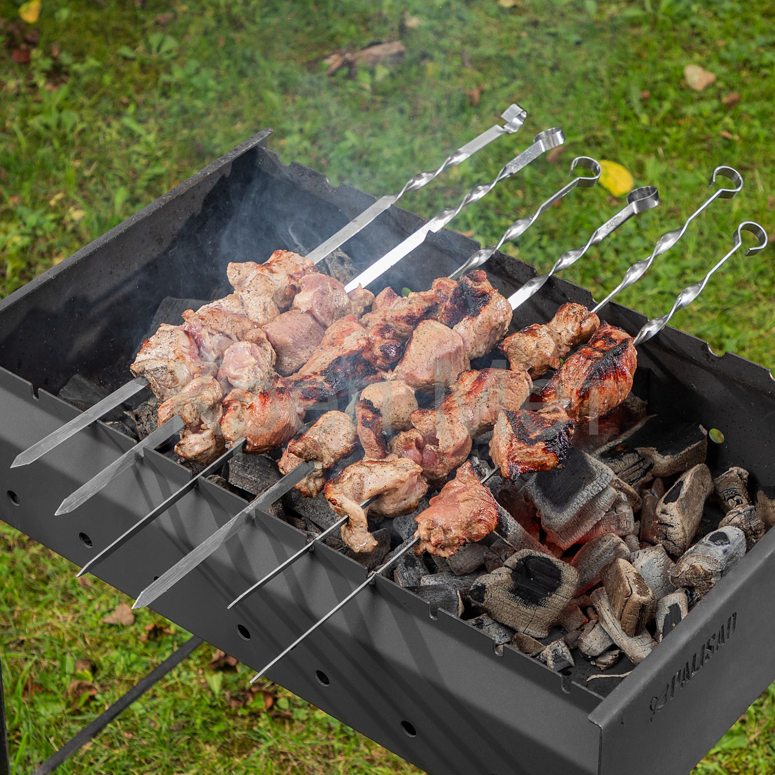 - Продуманная комплектация — 6 шампуров достаточно, чтобы приготовить обед для небольшой компании.