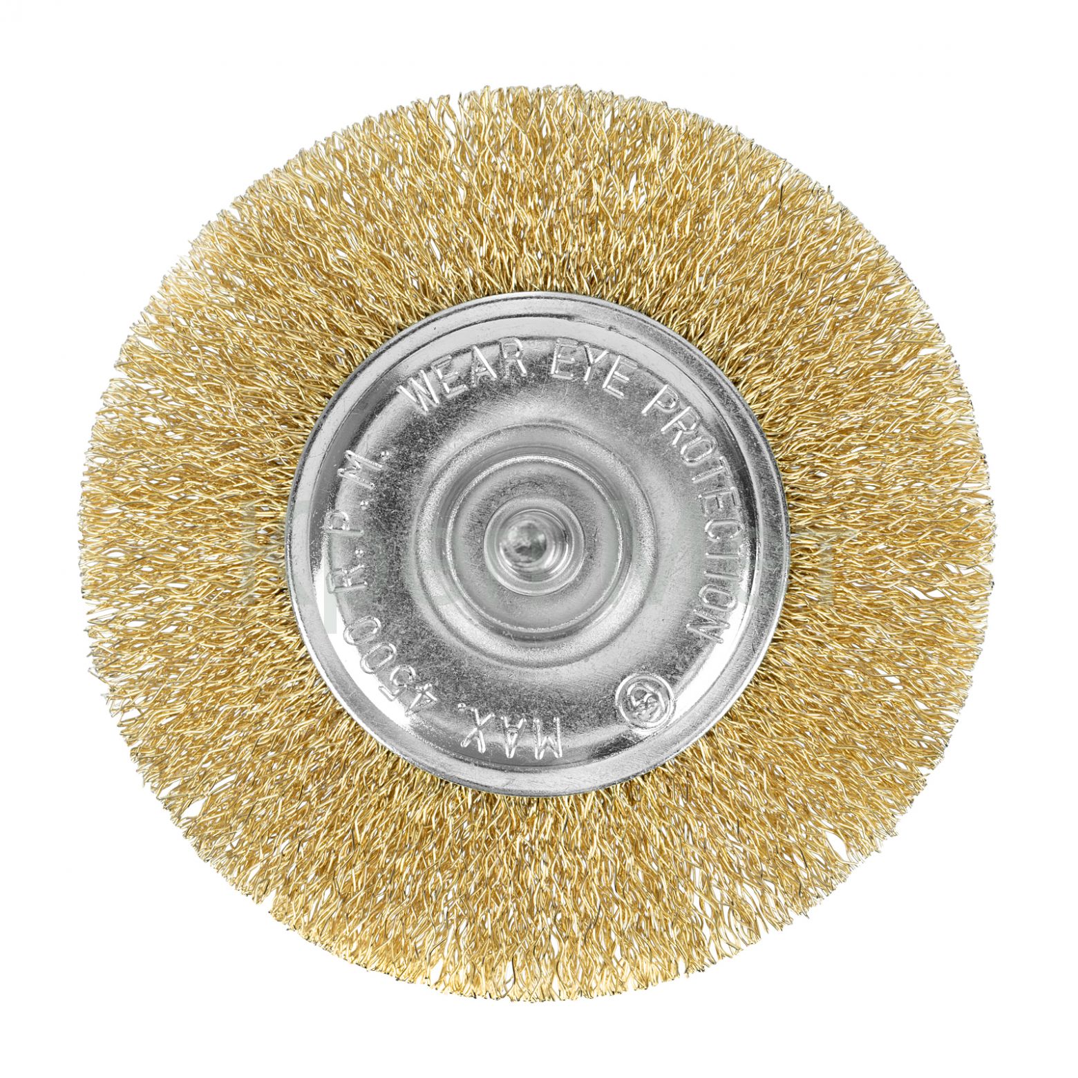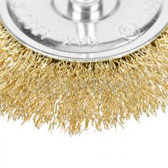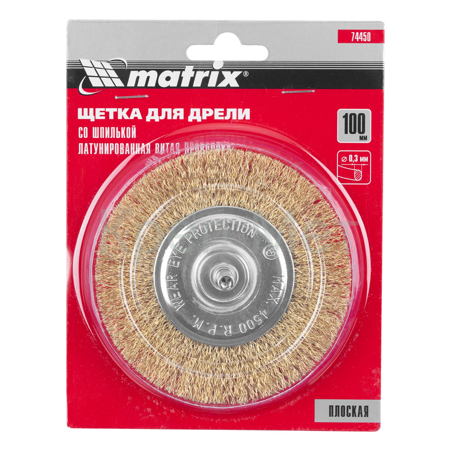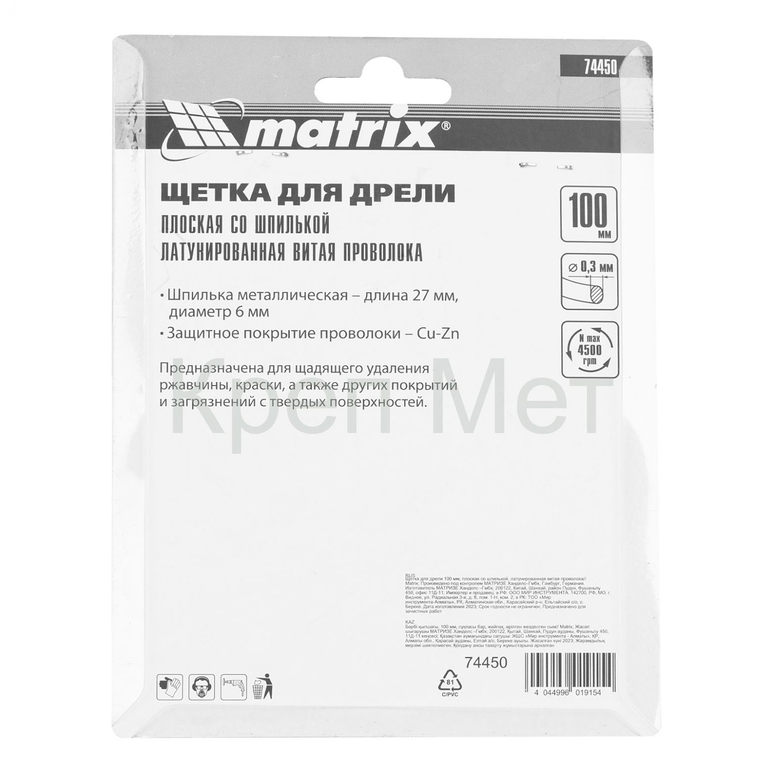 - Щетка для дрели 100 мм, плоская со шпилькой, латунированная витая проволока Matrix
