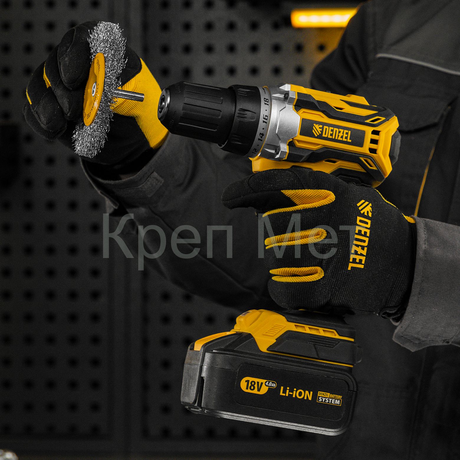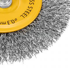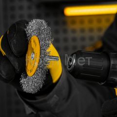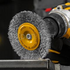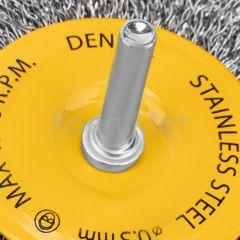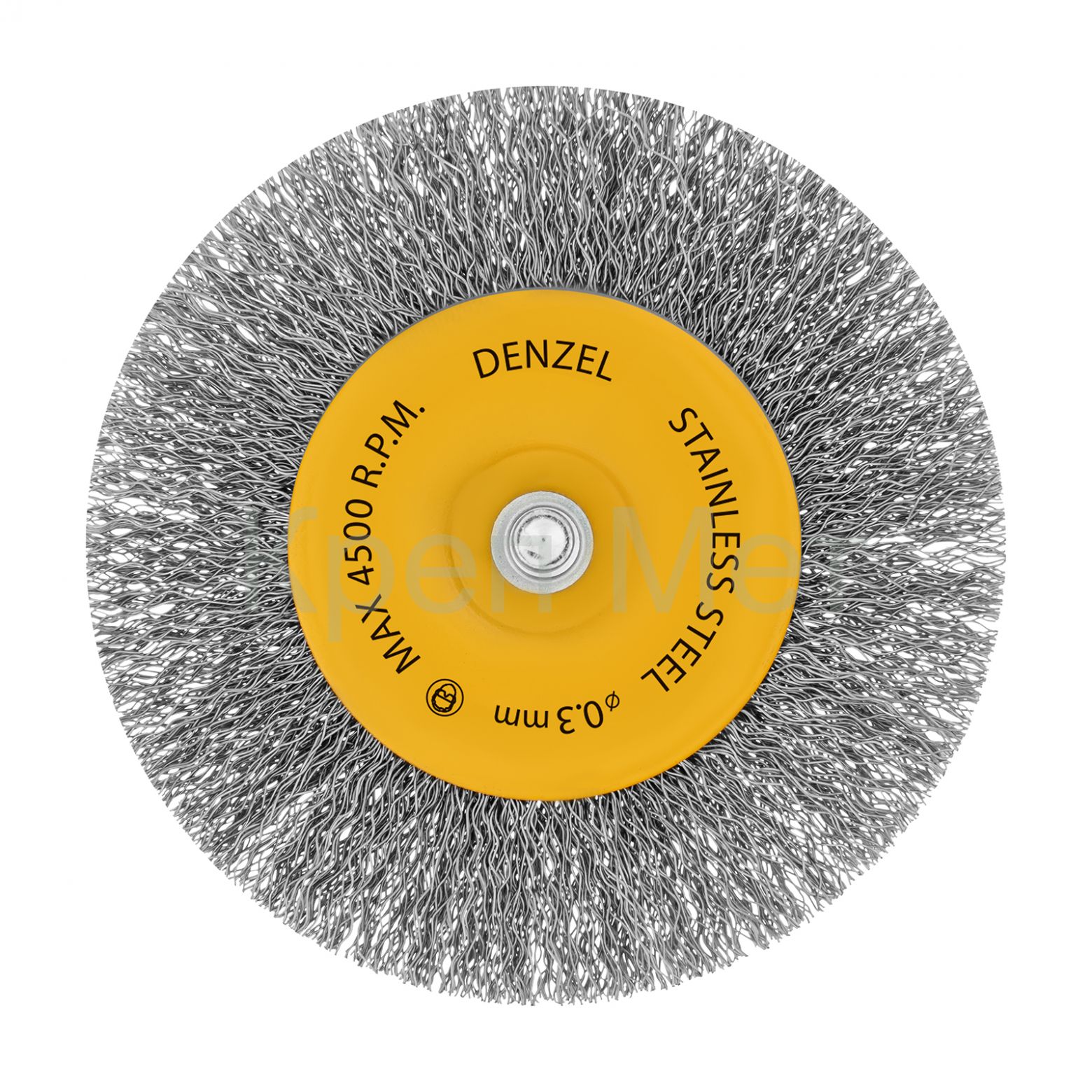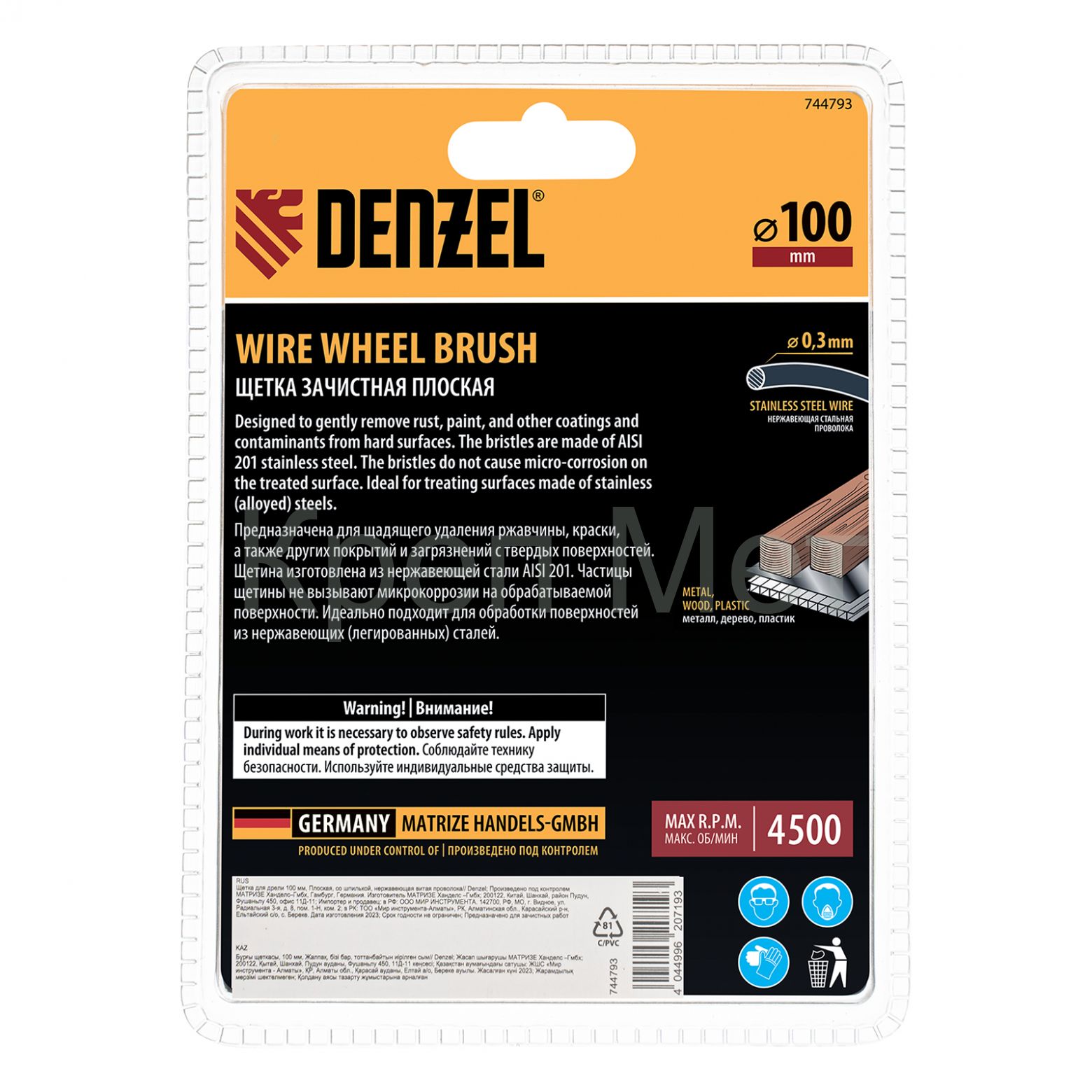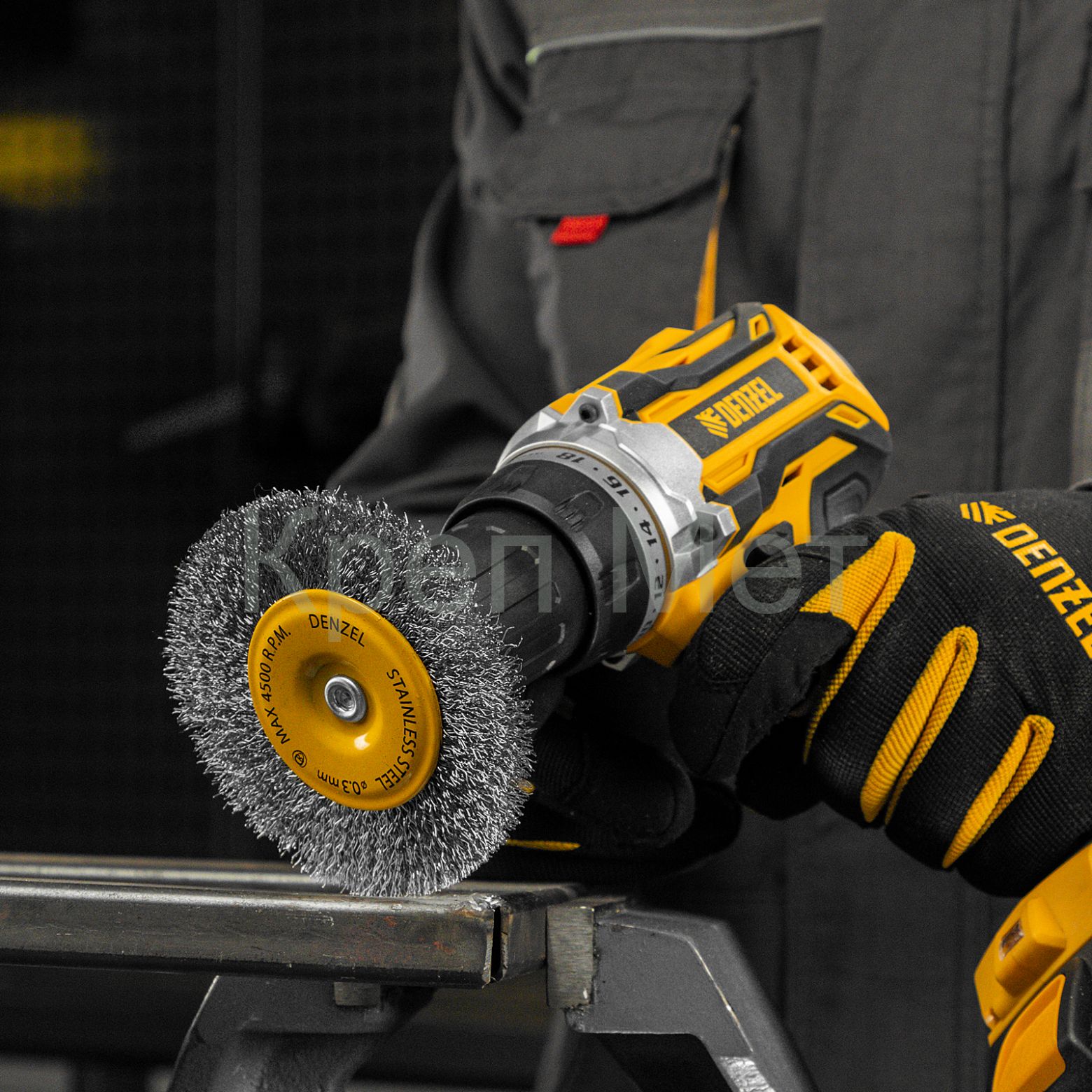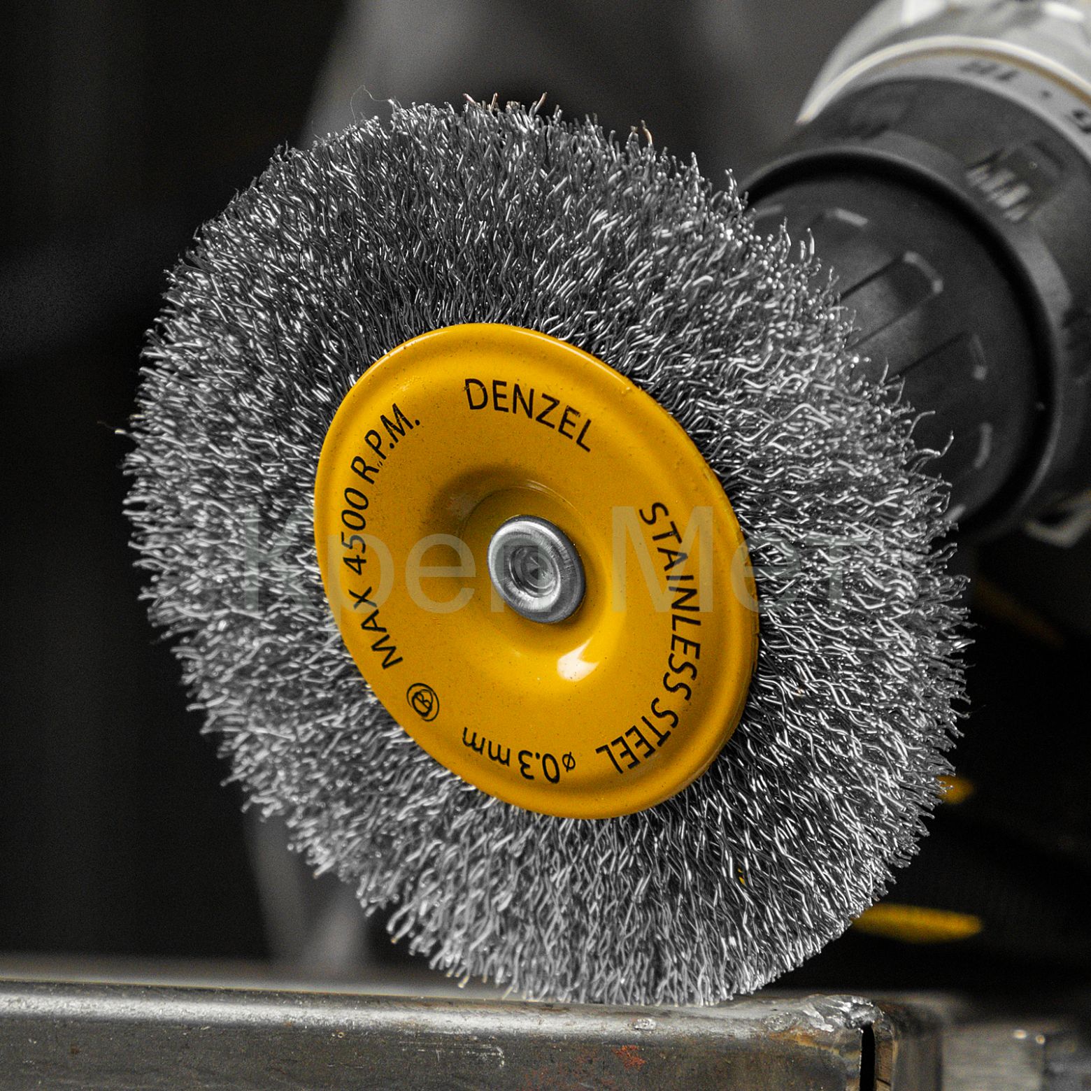 - Щетка для дрели 100 мм, Плоская, со шпилькой, нержавеющая витая проволока Denzel