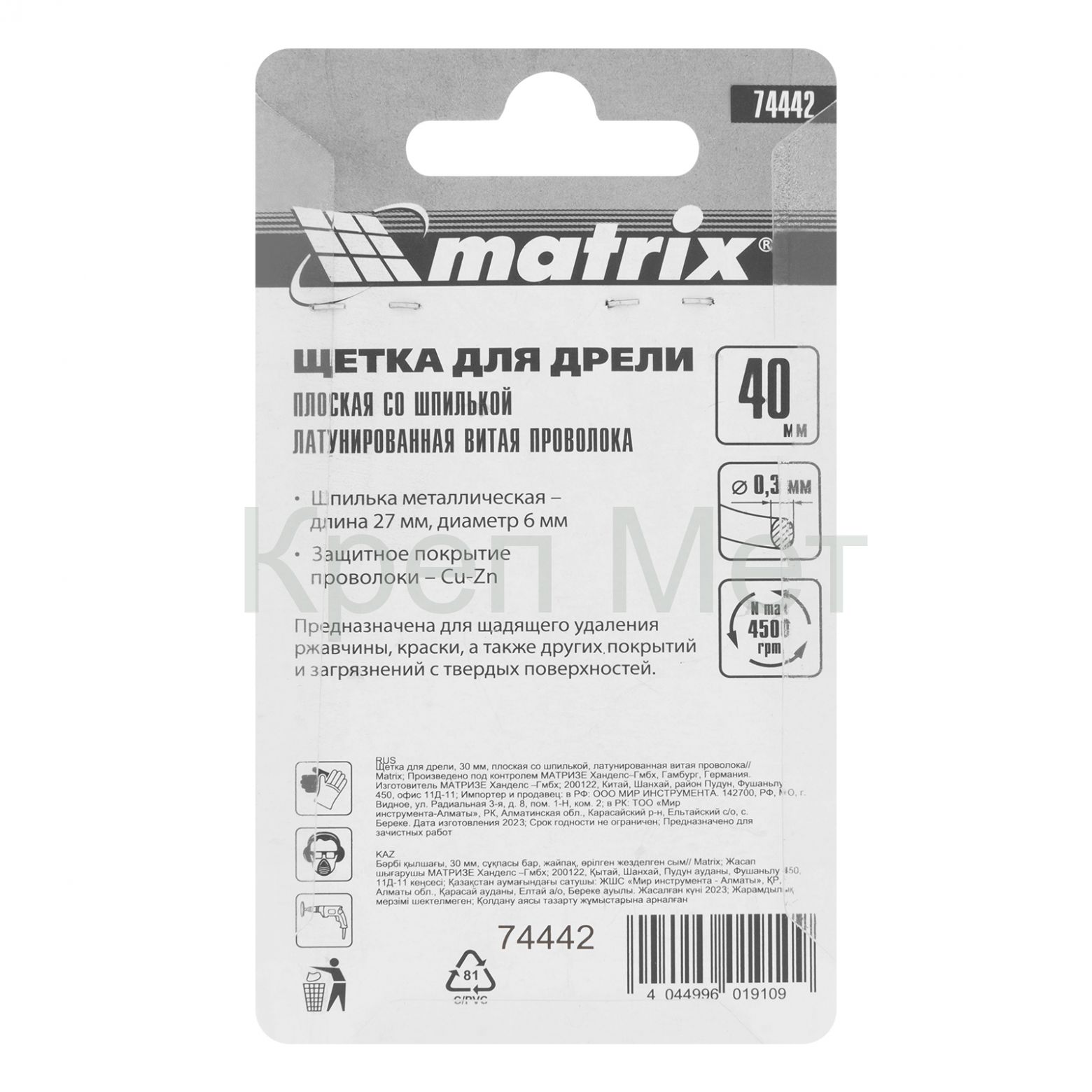 Плоская щетка для дрели Matrix 74442 диаметром 40 мм, со шпилькой и щетиной из латунированной витой проволоки, предназначена для бережной очистки металлических, деревянных, пластиковых поверхностей от загрязнений, старых лакокрасочных материалов и ржавчины. Витая проволока диаметром 0,3 мм проникает в труднодоступные места: пазы, углы, изгибы, узкие участки. Насадку применяют для придания поверхности нужной шероховатости или подчеркивания структуры материала. Хвостовик диаметром 6 мм устанавливается в патрон электродрели, способной работать на рекомендуемой скорости 4500 об/мин. Во время работы следует использовать защитные очки, респиратор, наушники, спецодежду и обувь.