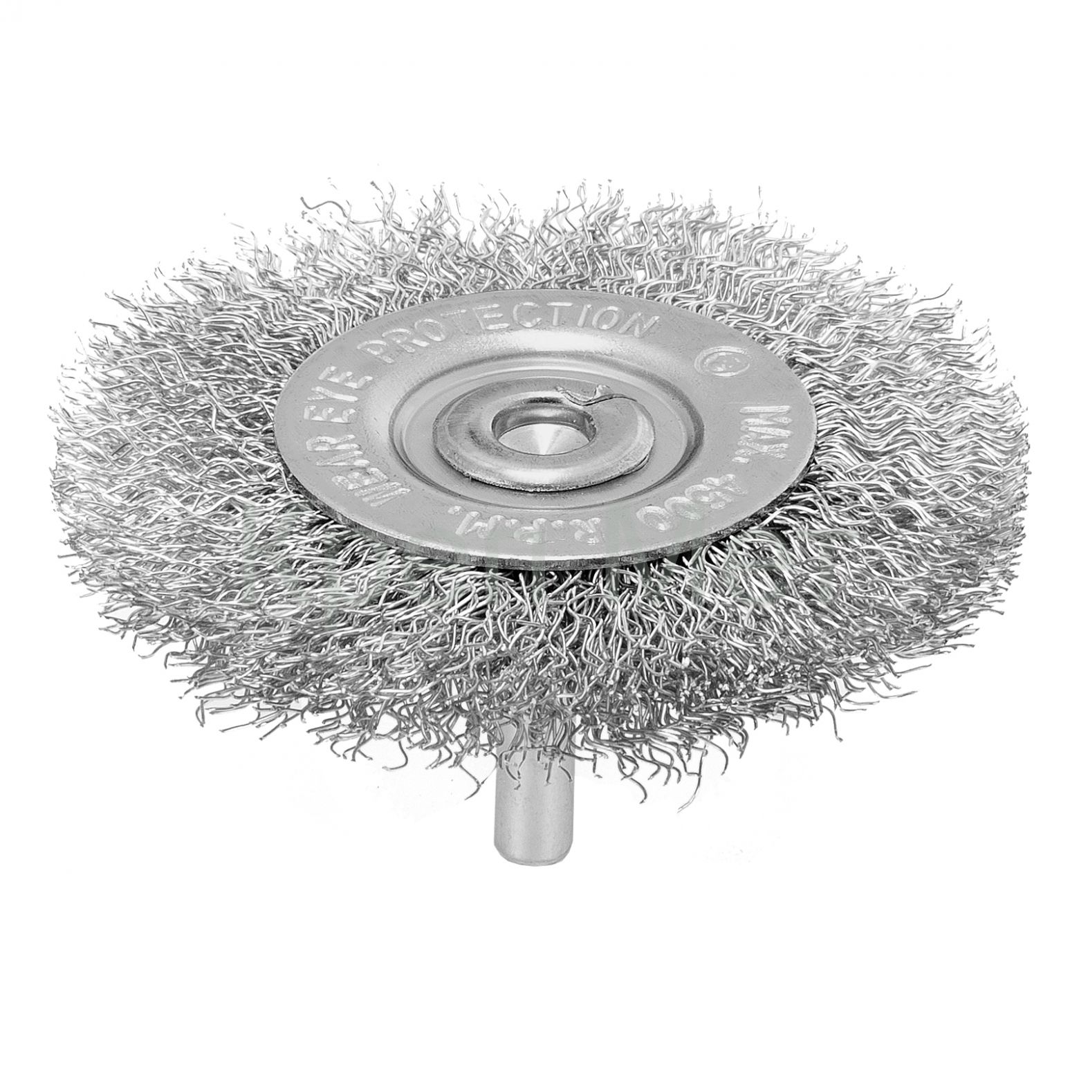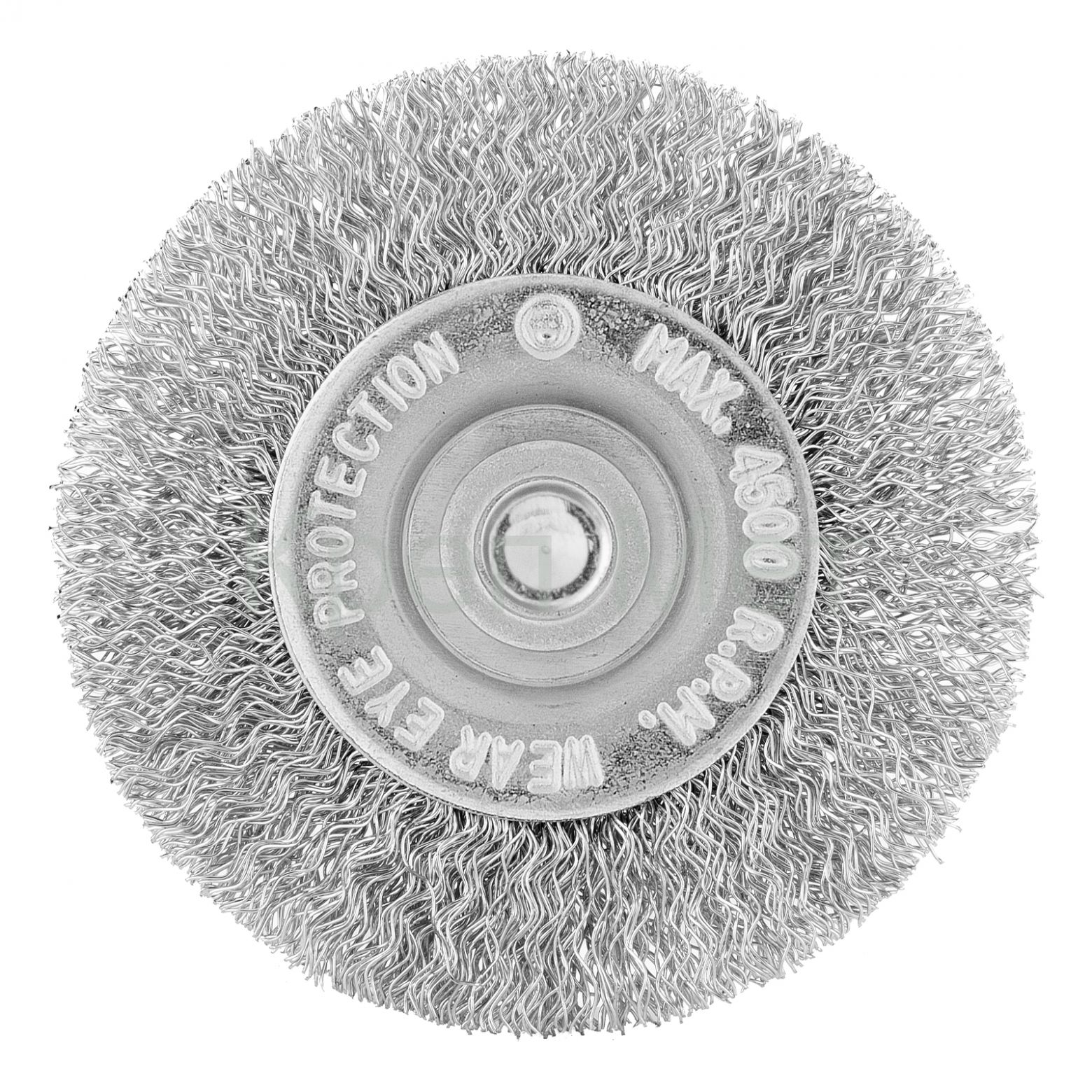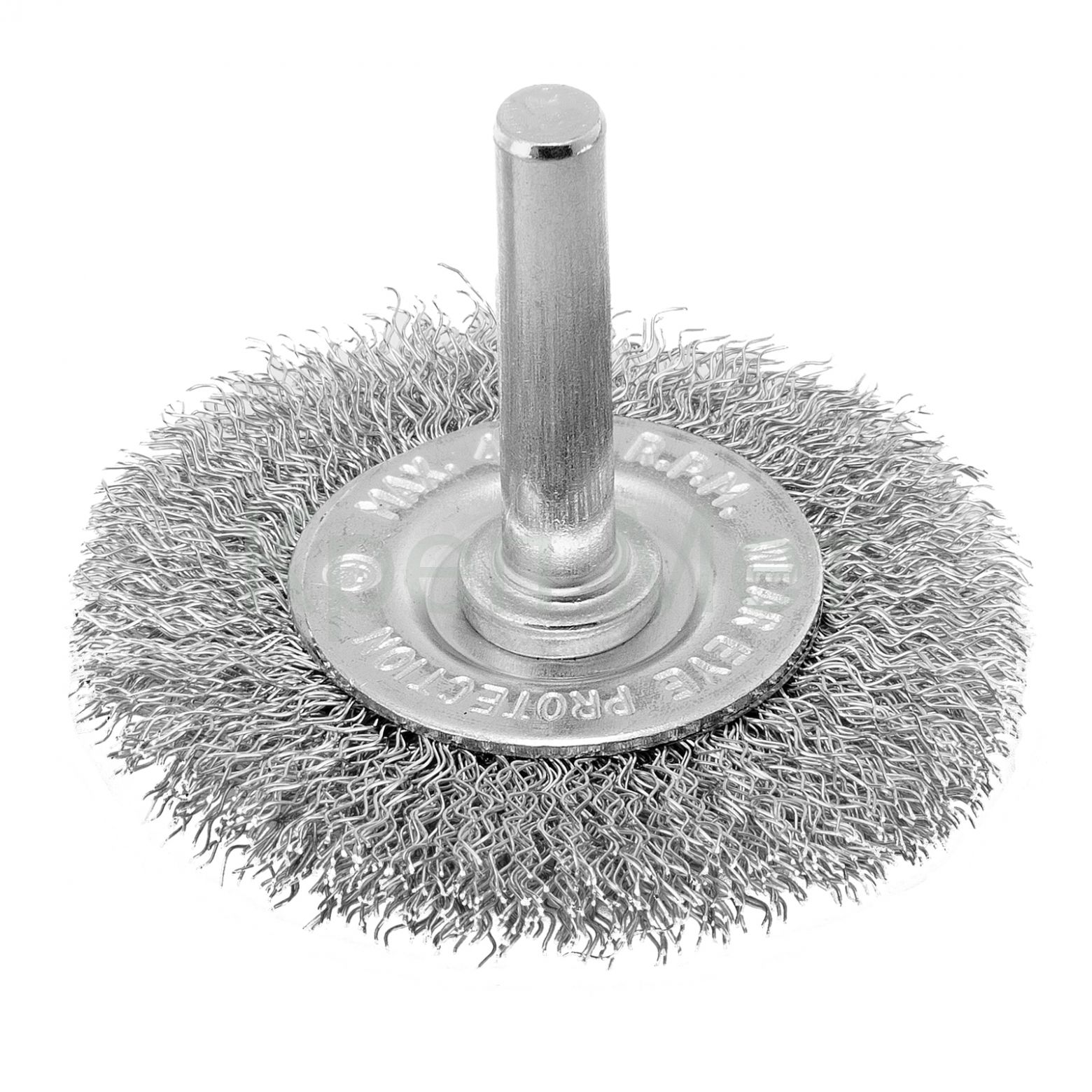 Плоская щетка для дрели Сибртех 744467 диаметром 60 мм, со шпилькой и щетиной из витой проволоки 0,3 мм, используется для щадящей обработки металлических, деревянных и пластиковых поверхностей. Удаляет загрязнения, ржавчину, старые лакокрасочные покрытия. Благодаря плоской форме щетка идеально подходит для очистки труднодоступных мест, пазов, изгибов, внутренних углов. Хвостовик диаметром 6 мм устанавливается в патрон дрели. Рекомендуемая скорость вращения 4500 об/мин. Во время работы следует использовать средства индивидуальной защиты. Щетку применяют во время строительства, ремонта, а также в быту.