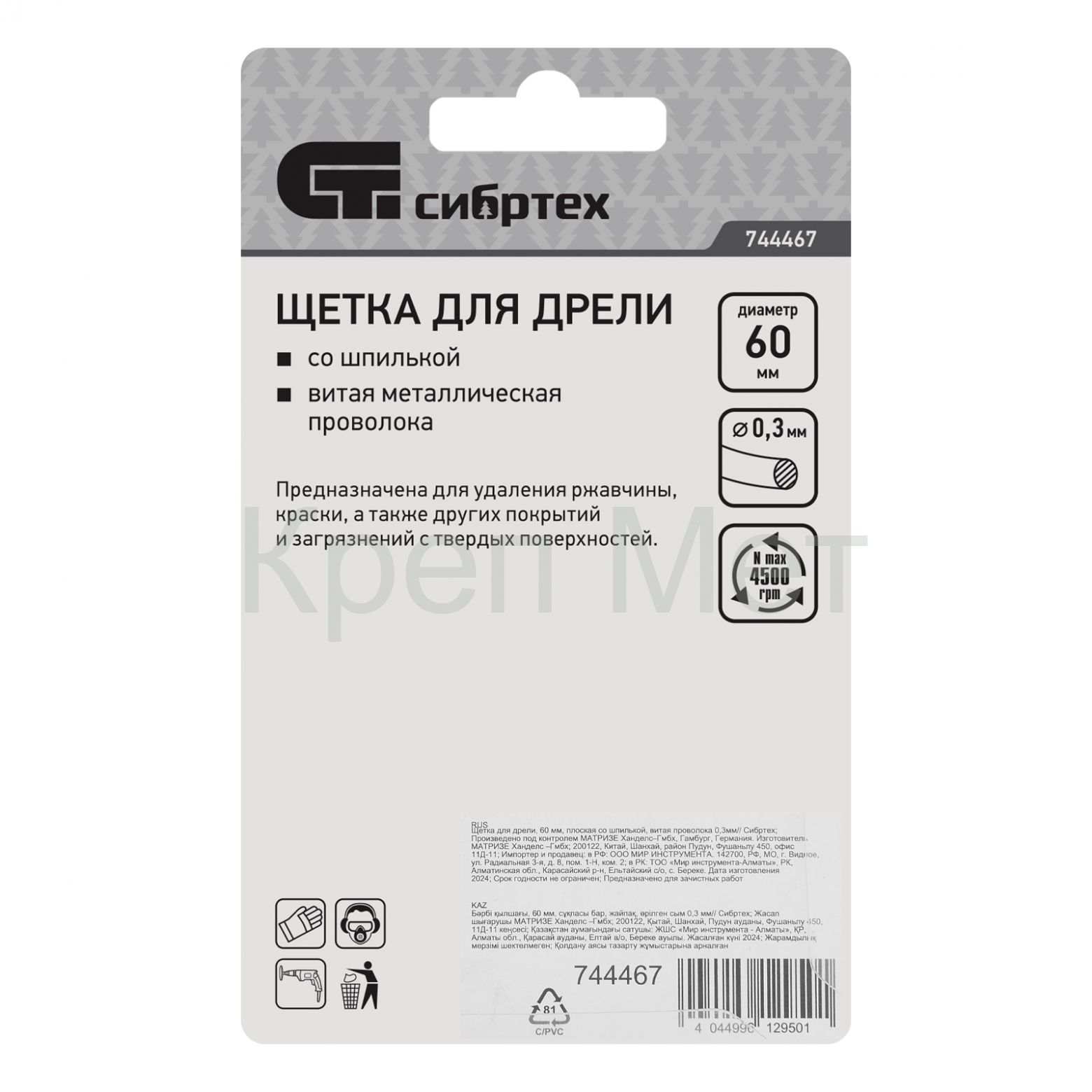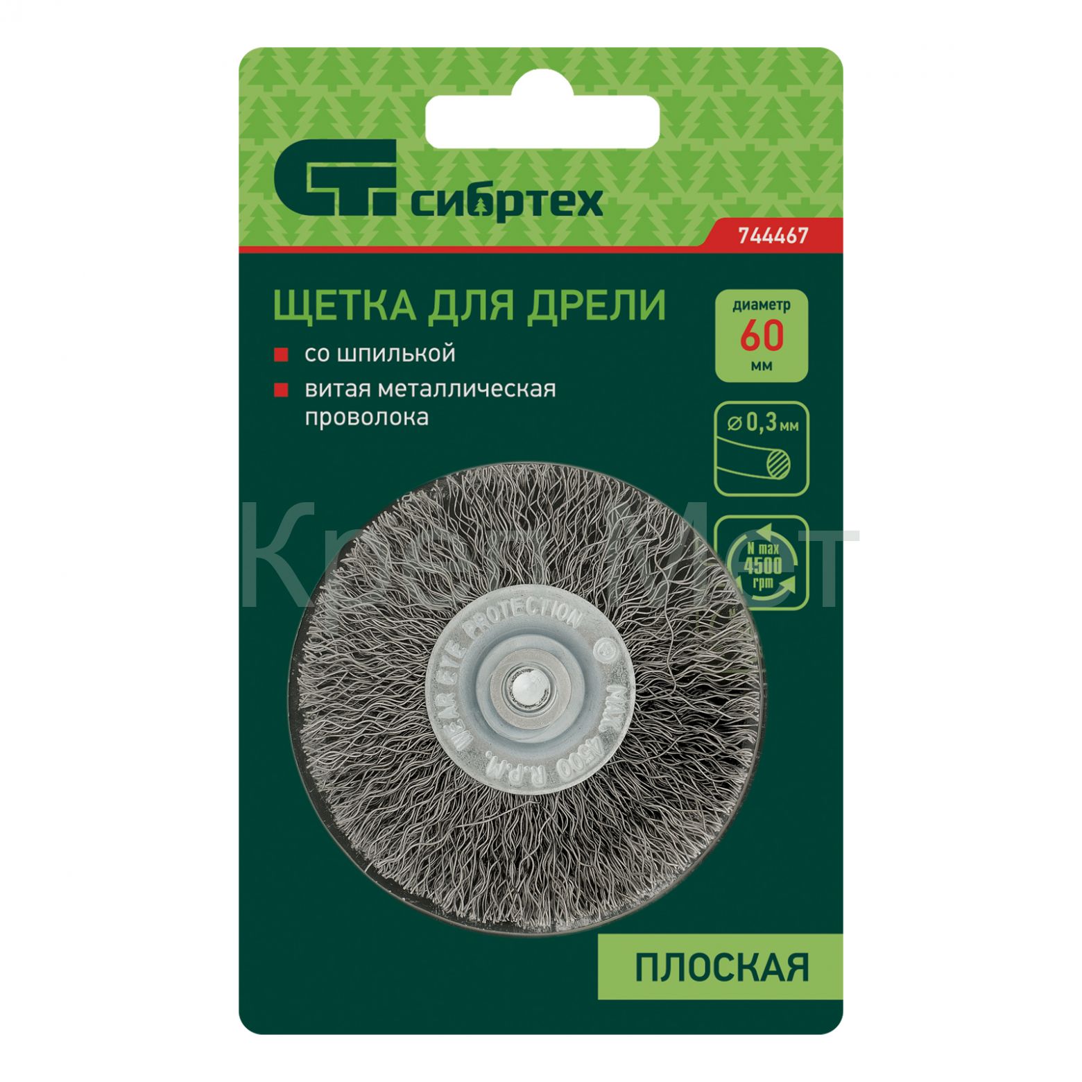 Щетка для дрели, 60 мм, плоская со шпилькой, витая проволока Сибртех
