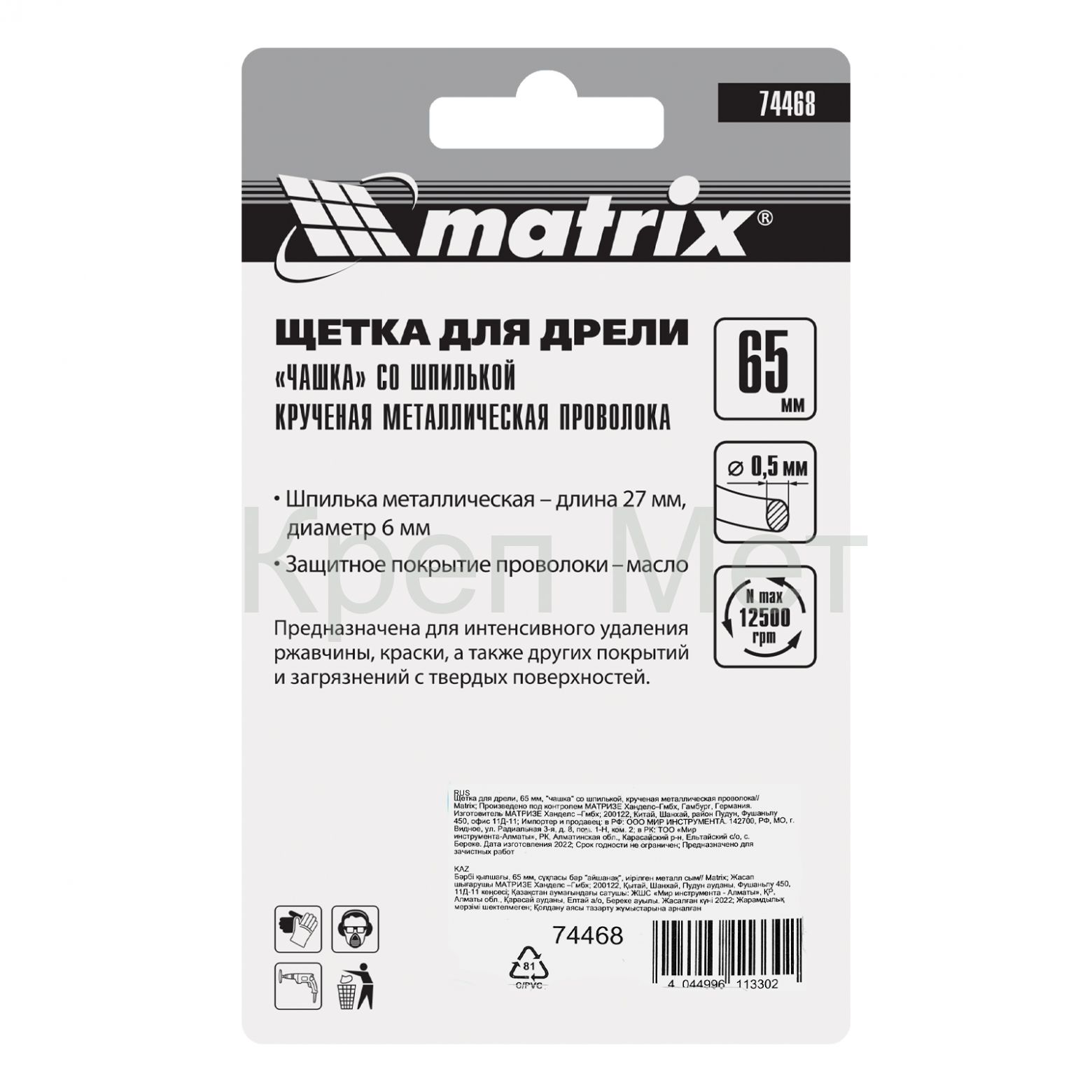 Щетка для дрели «чашка» Matrix 74468 диаметром 65 мм, со шпилькой и щетиной из крученой металлической проволоки, — оснастка для электродрелей с патроном под хвостовик диаметром 6 мм. Рекомендуемая скорость вращения 12500 об/мин. Насадку используют для зачистки сварных швов и черновой обработки металлических, деревянных, бетонных поверхностей. Щетка эффективно удаляет толстый слой загрязнений, ржавчины, ЛКМ. Благодаря форме «чашка» насадка оптимальна для обработки значительных по площади поверхностей. Ее применяют в строительстве, машиностроении, а также в быту. Во время работы необходимо использовать средства индивидуальной защиты.