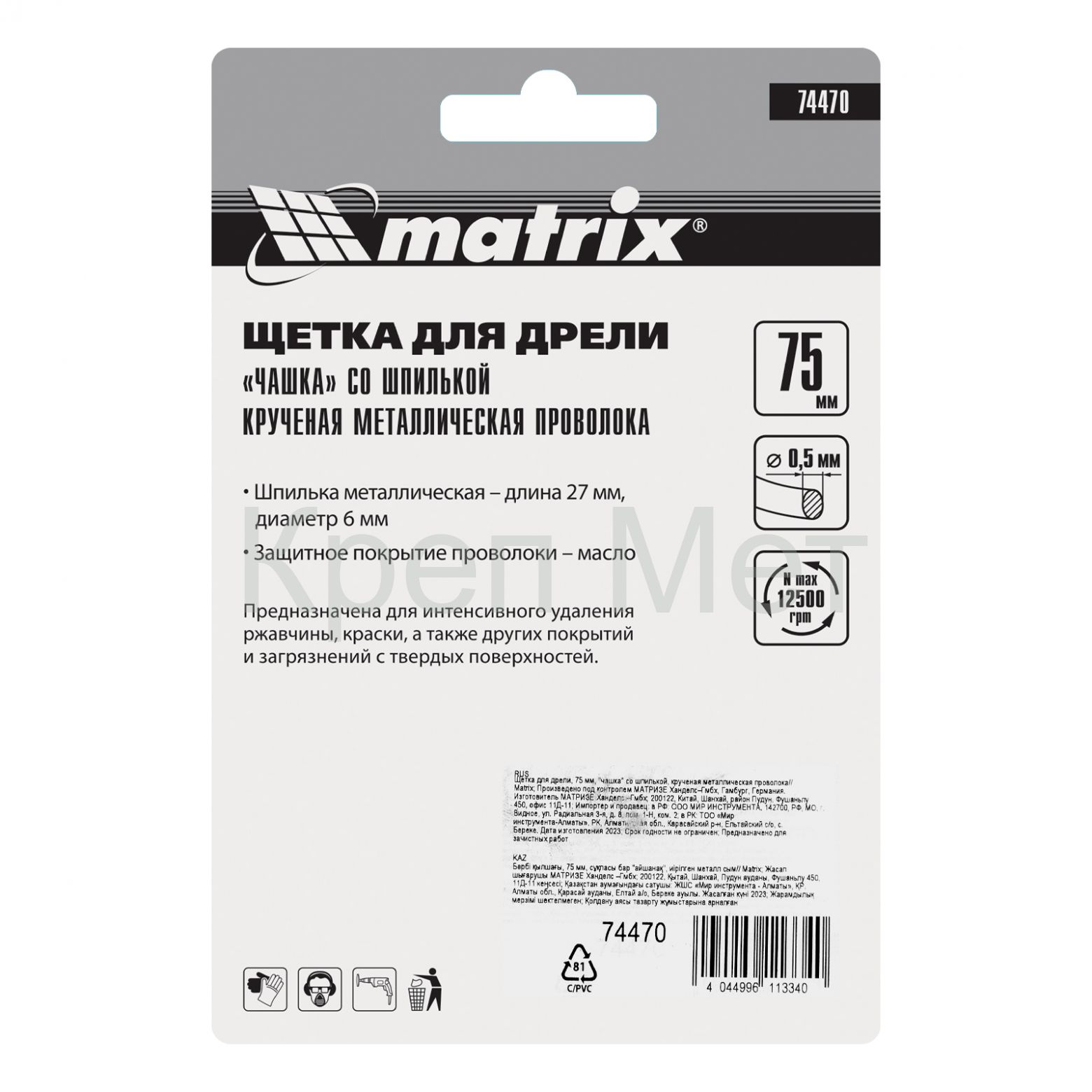 Щетка для дрели «чашка» Matrix 74470 диаметром 75 мм, со шпилькой и щетиной из крученой металлической проволоки, — оснастка для электродрелей с патроном под хвостовик диаметром 6 мм. Рекомендуемая скорость вращения 12500 об/мин. Насадку используют для зачистки сварных швов и черновой обработки металлических, деревянных, бетонных поверхностей. Щетка эффективно удаляет толстый слой загрязнений, ржавчины, ЛКМ. Благодаря форме «чашка» насадка оптимальна для обработки значительных по площади поверхностей. Ее применяют в строительстве, машиностроении, а также в быту. Во время работы необходимо использовать средства индивидуальной защиты.
