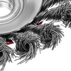 Щетка Matrix «тарелка» 74609 диаметром 100 мм, с щетиной из крученой проволоки толщиной 0,5 мм, устанавливается на УШМ при помощи гайки М14. Выполнена в форме тарелки, за счет чего подходит для грубой (черновой) обработки плоских и угловых поверхностей. Удаляет ржавчину, загрязнения, лакокрасочные покрытия, подходит для зачистки сварных швов. Использование на скорости до 12500 об/мин позволяет продлить срок службы насадки.