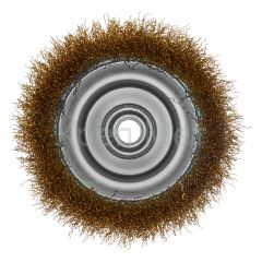 Щетка «чашка» Matrix 74606 диаметром 125 мм, с щетиной из латунированной витой проволоки, устанавливается на вал УШМ с помощью гайки М14. Предназначена для снятия тонкого слоя краски или лака, удаления ржавчины и загрязнений. При рекомендованной скорости вращения 6500 об/мин щеткой можно быстро обрабатывать участки большой площади.
