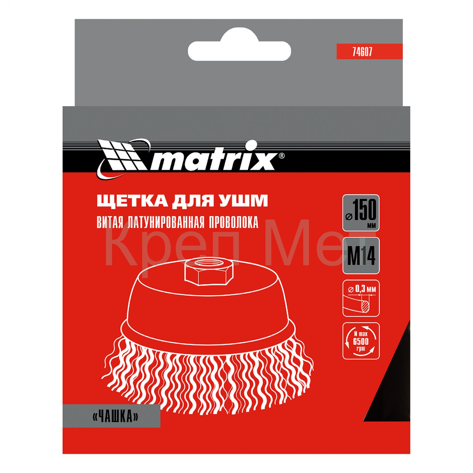 Щетка «чашка» Matrix 74607 диаметром 150 мм, с щетиной из латунированной витой проволоки, устанавливается на вал УШМ с помощью гайки М14. Предназначена для снятия тонкого слоя краски или лака, удаления ржавчины и загрязнений. При рекомендованной скорости вращения 4500 об/мин щеткой можно быстро обрабатывать участки большой площади.
