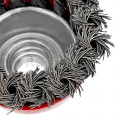 Щетка Matrix «Чашка» 74620 диаметром 65 мм, с присоединительной резьбой М14, с щетиной из крученой проволоки диаметром 0,5 мм, устанавливается на УШМ, поддерживающую работу со скоростью 12500 об/мин. Изделие предназначено для грубой (черновой) обработки поверхностей, подходит для удаления загрязнений, снятия толстого слоя ржавчины, ЛКМ, зачистки сварных швов.