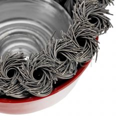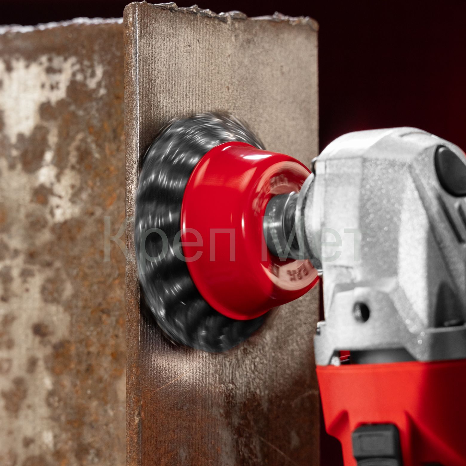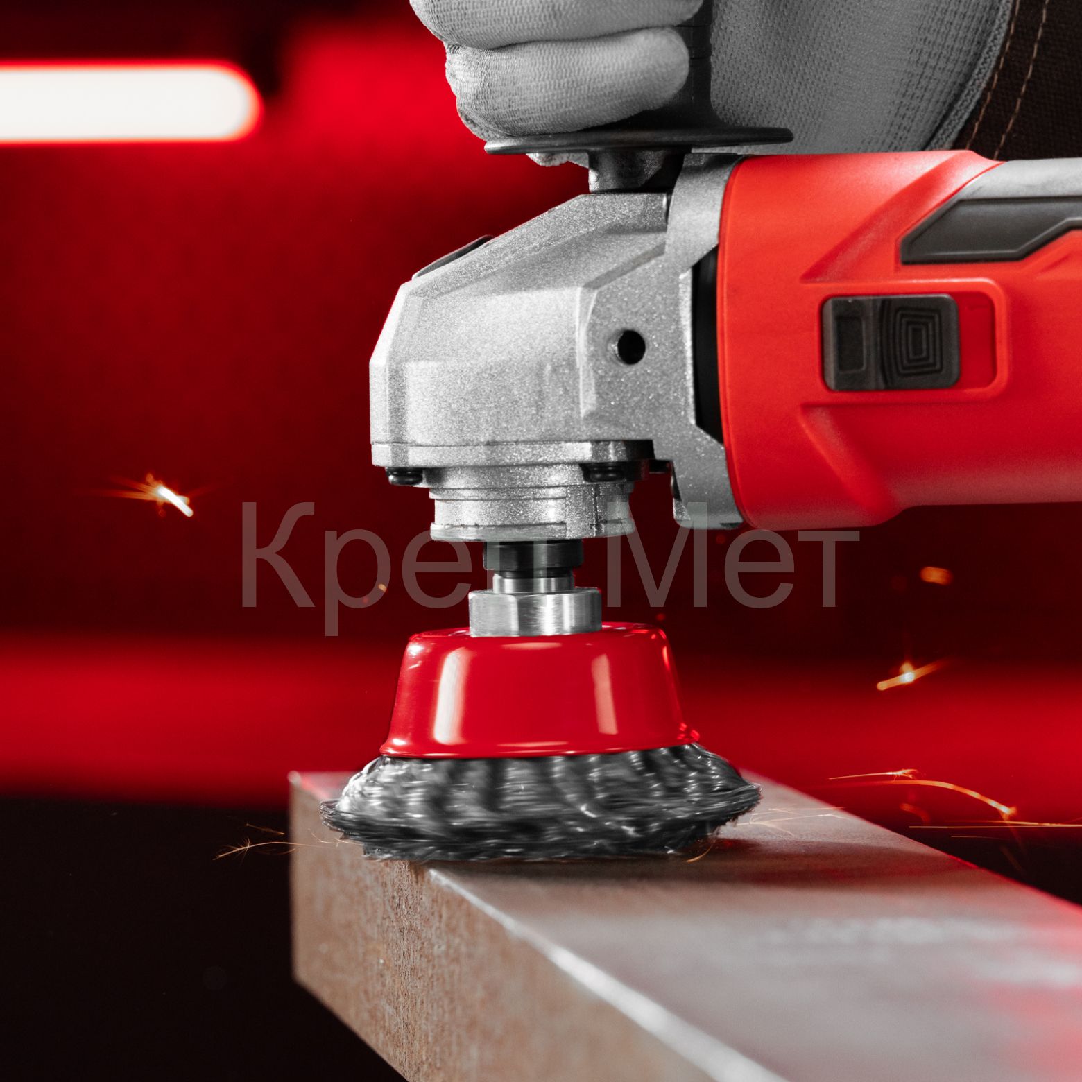 Щетка Matrix «Чашка» 74624 диаметром 75 мм, с присоединительной резьбой М14, с щетиной из крученой проволоки диаметром 0,5 мм, устанавливается на УШМ, поддерживающую работу со скоростью 12500 об/мин. Изделие предназначено для грубой (черновой) обработки поверхностей и подходит для удаления загрязнений, снятия толстого слоя ржавчины, ЛКМ, зачистки сварных швов.
