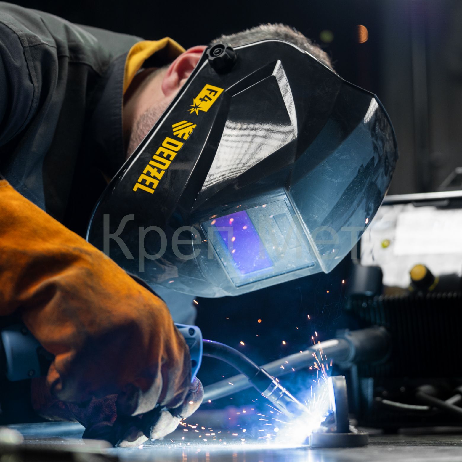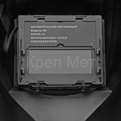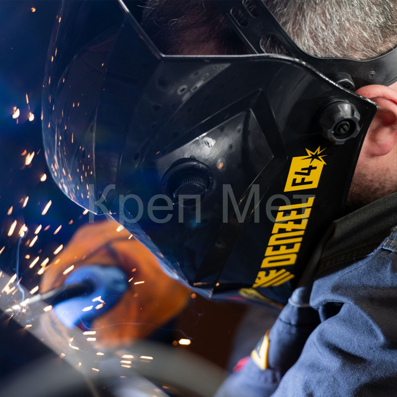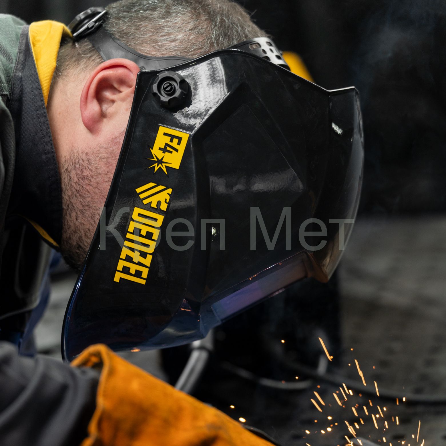 Защитный лицевой щиток (маска сварщика) Denzel F4 89715 со смотровым окном размером 90 x 35 мм и функцией затемнения DIN 4/9-13 используется во время проведения сварочных работ. Надежно защищает глаза и лицо пользователя от искр, брызг расплавленного металла, а также от инфракрасного и ультрафиолетового излучения. Корректную работу светофильтра обеспечивают два фотодатчика. Щиток подходит для проведения сварочных работ в режимах MMA, MIG/MAG, TIG, а также для выполнения плазменно-дуговой сварки, плазменной и дуговой резки.