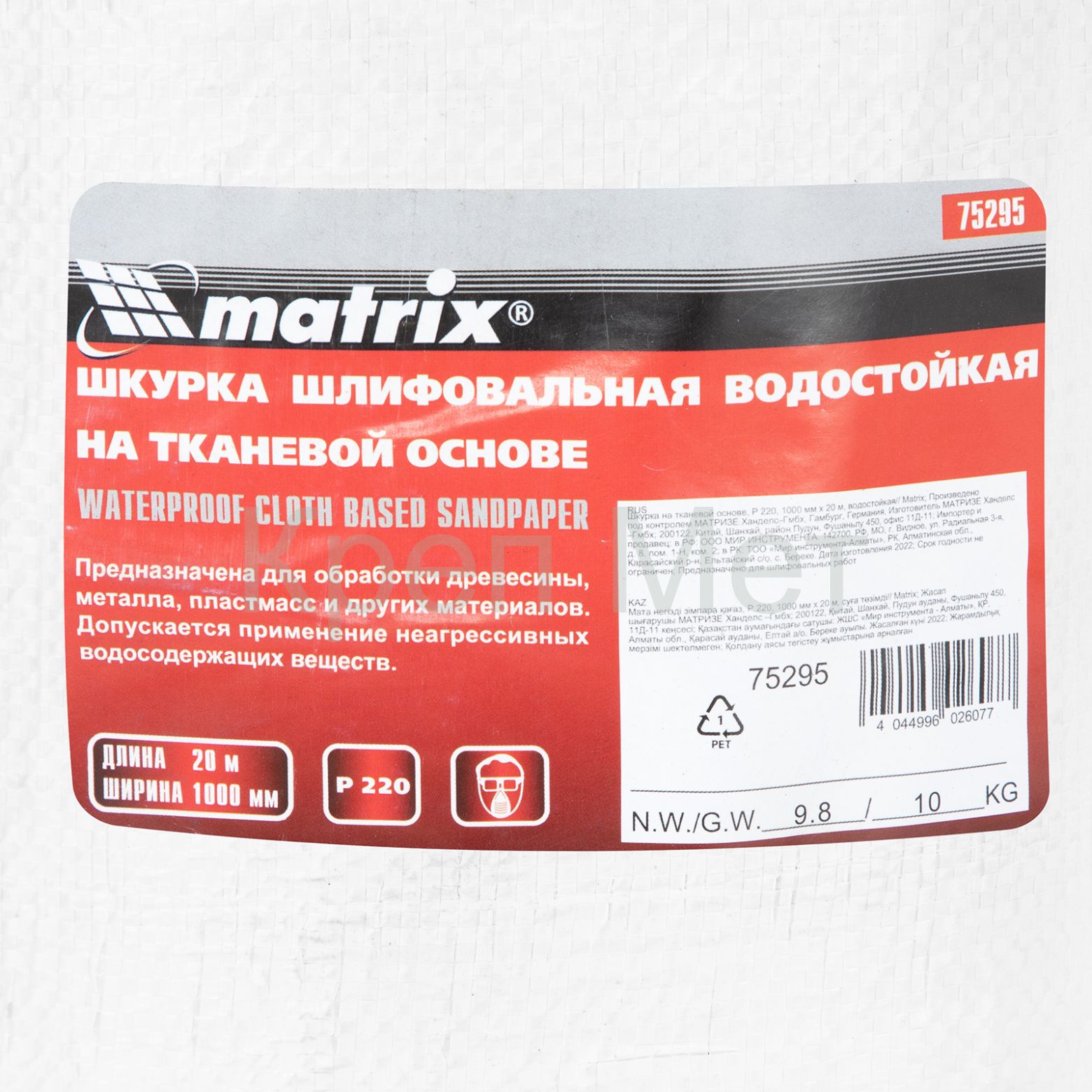 - Шкурка на тканевой основе, P 220, 1000 мм х 20 м, водостойкая Matrix