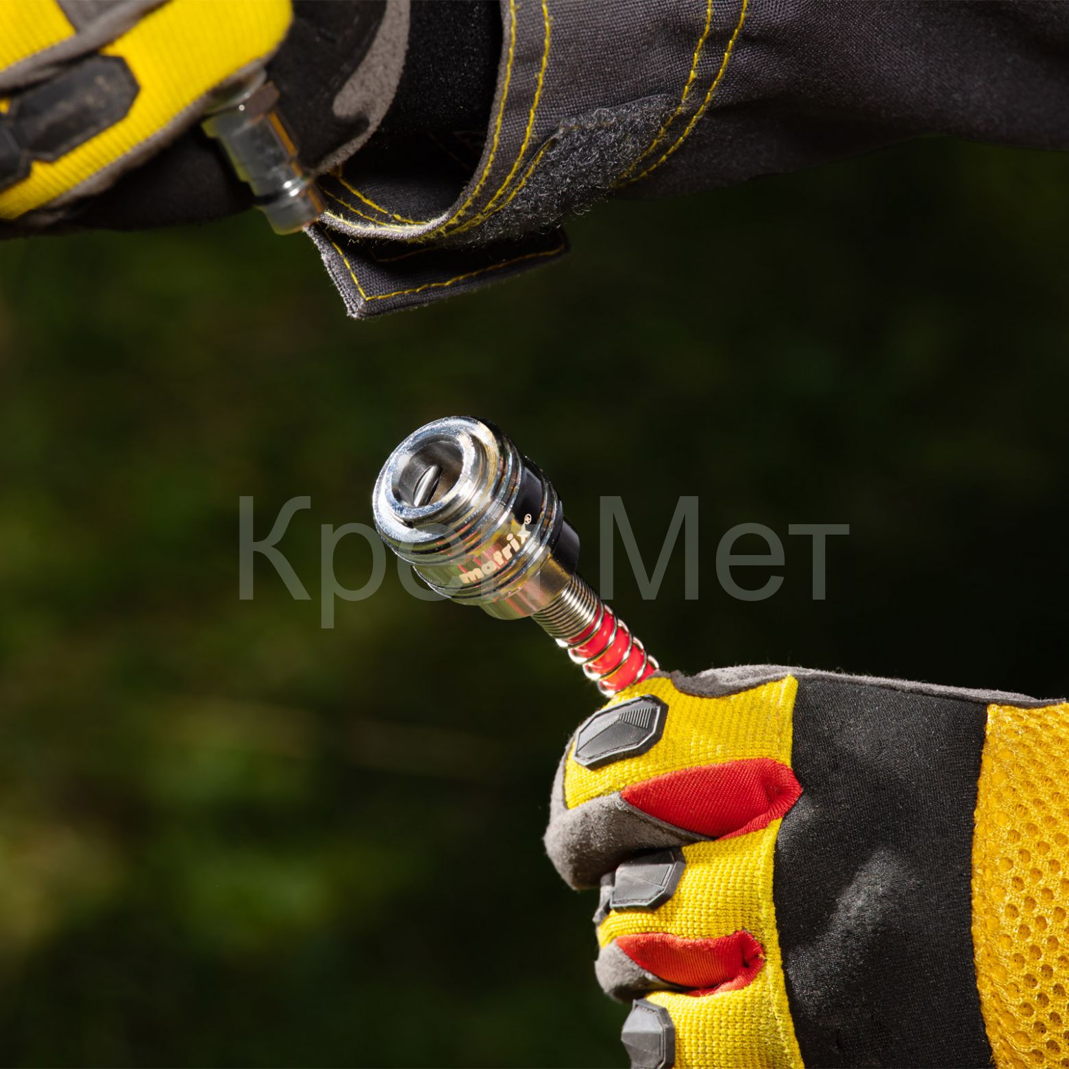 - Быстроразъемное соединение ускоряет подключение пневмоинструментов, что экономит время и силы мастера.