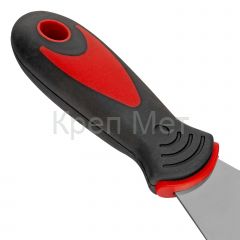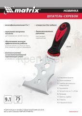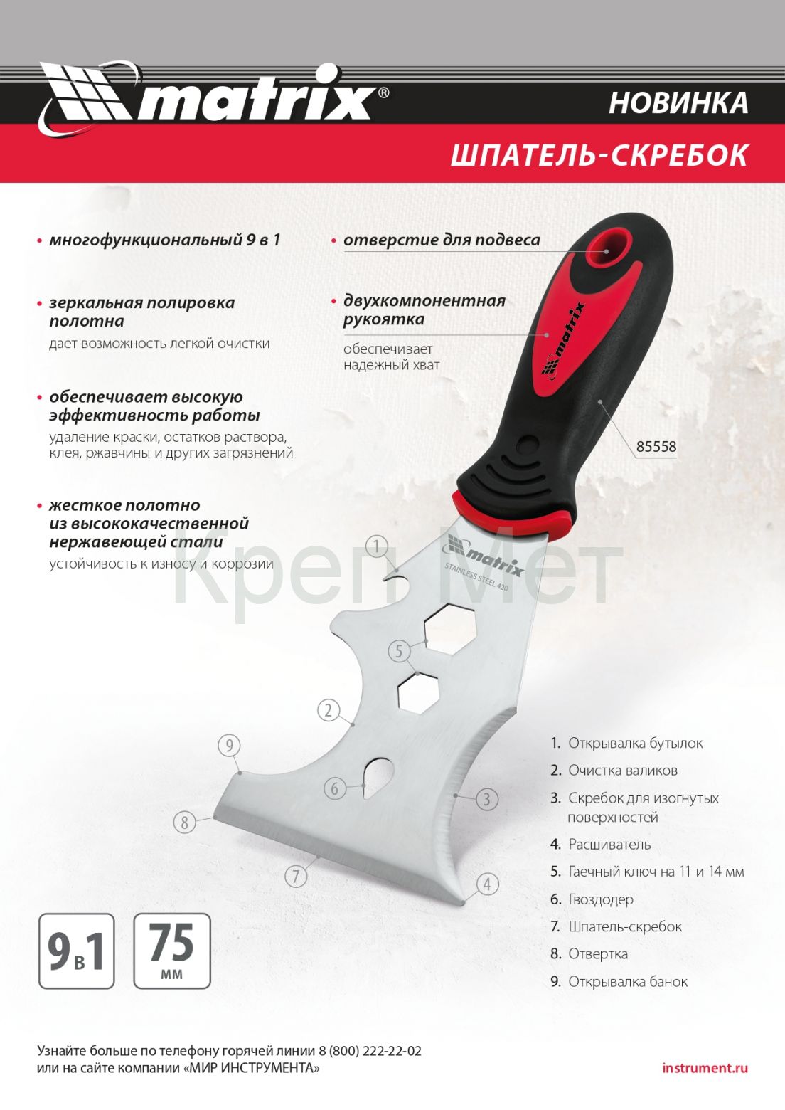 Многофункциональный шпатель-скребок Matrix 85558 9 в 1 с двухкомпонентной рукояткой имеет лезвие сложной конфигурации из нержавеющей стали. Используется для очищения поверхностей от шпатлевки, остатков цемента, зачистки труб и т. д. На жестком полированном полотне с лезвием шириной 75 мм предусмотрены выемки различной формы, благодаря которым инструмент можно использовать в качестве ключа на 11 и 15 мм, а также применять для очистки валиков, извлечения гвоздей, поддевания предметов, открывания банок с краской, равномерного нанесения смесей и выполнения прочих работ.
