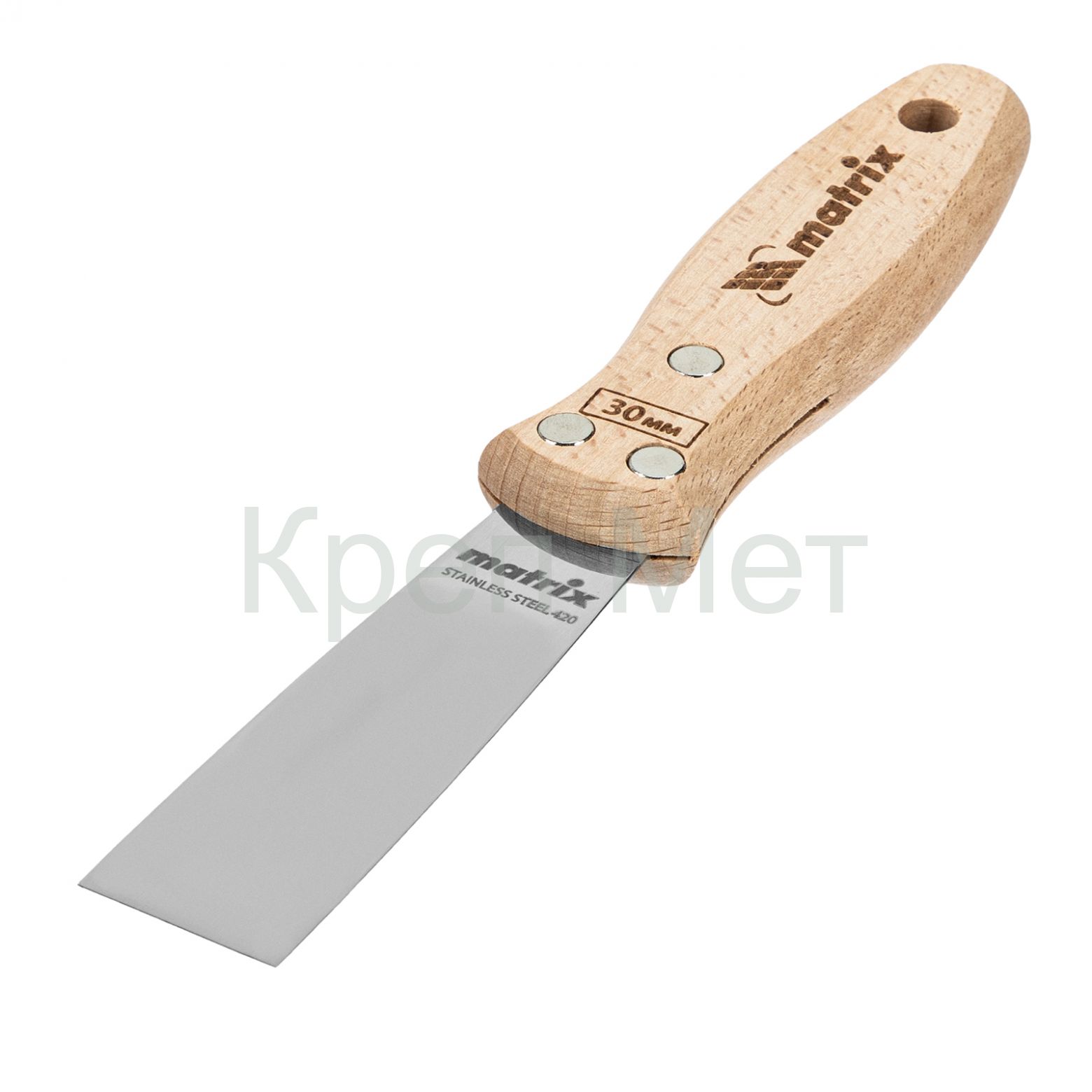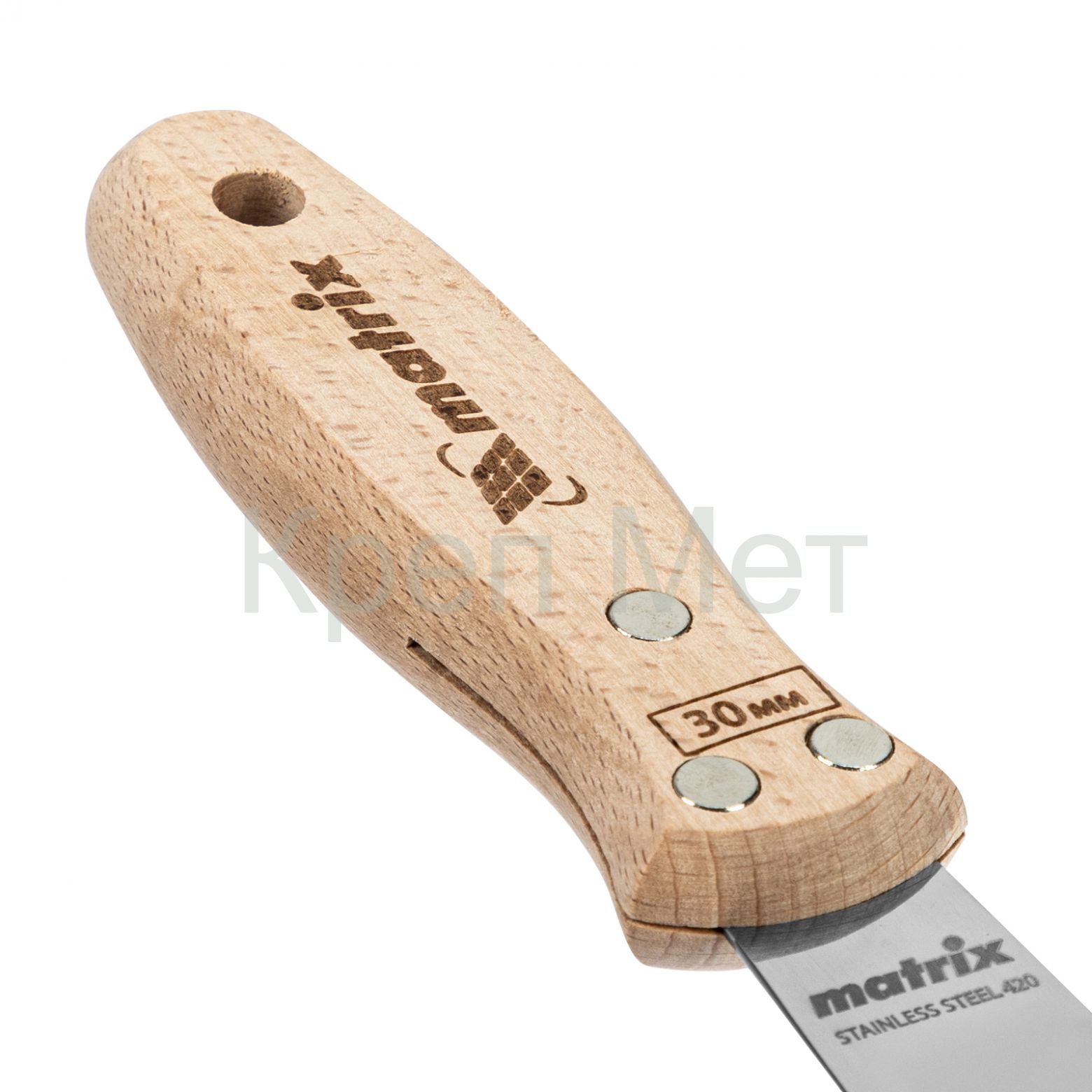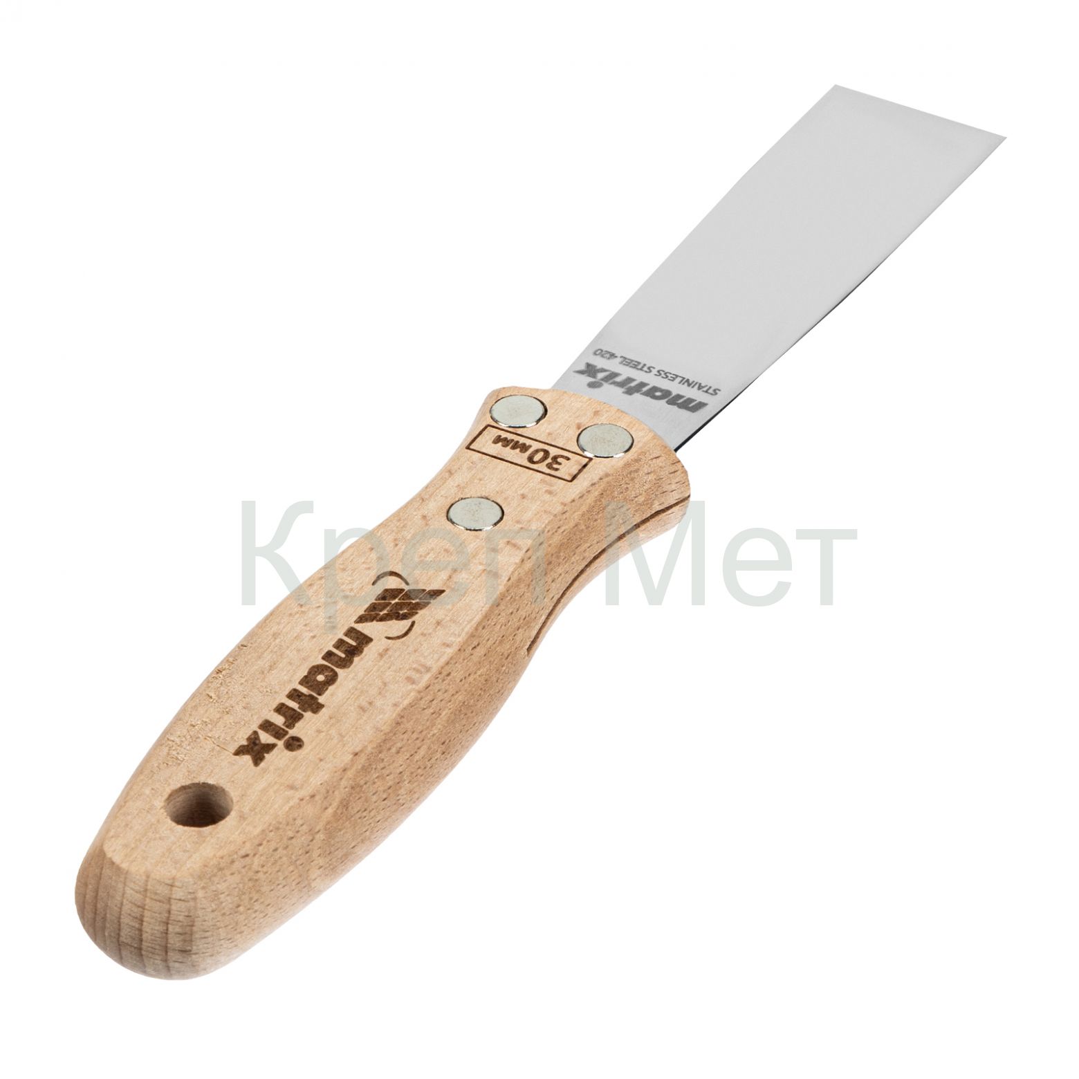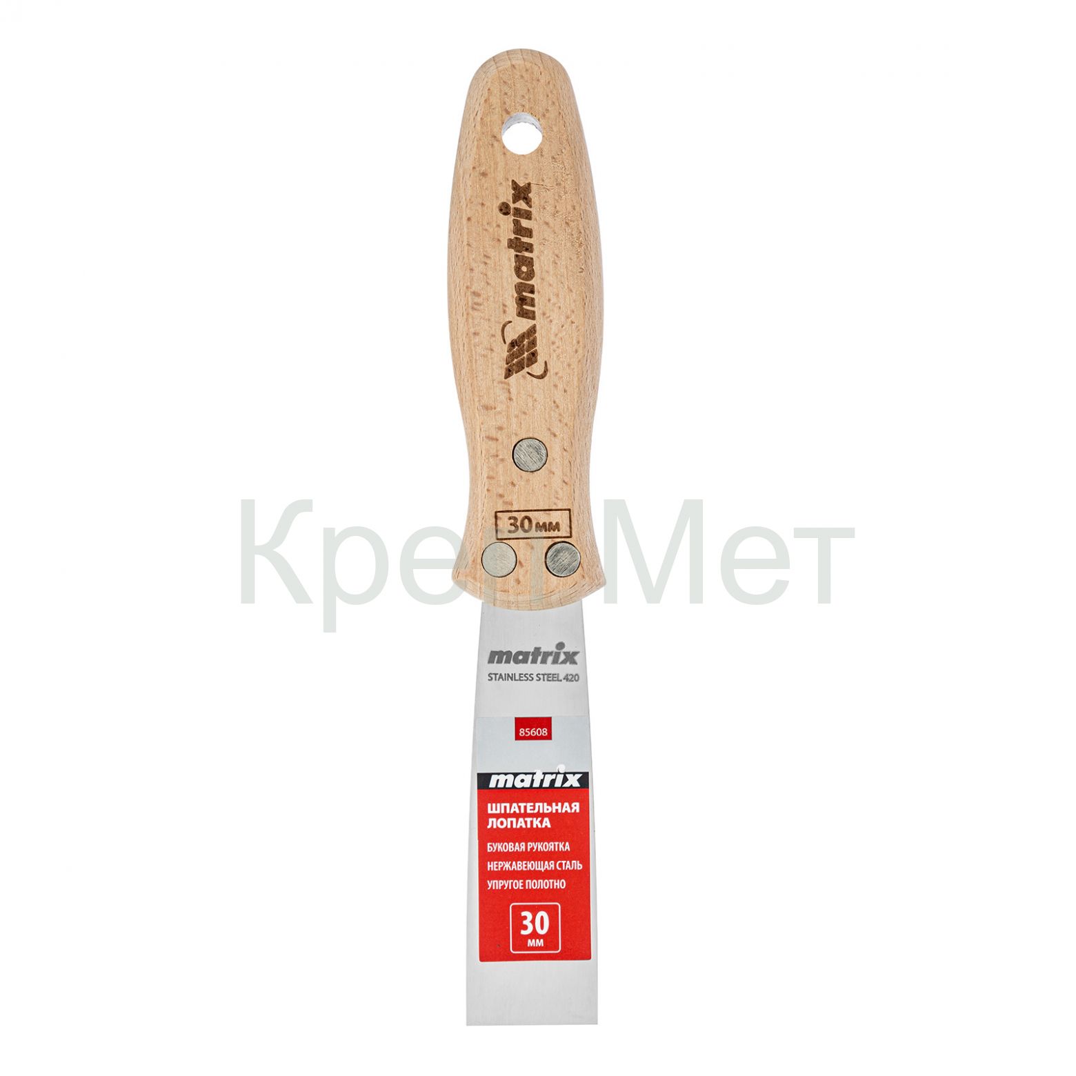 Шпательная лопатка Matrix 85608 с полотном из нержавеющей стали шириной 30 мм и буковой рукояткой предназначена для работы со строительными растворами. Применяется для нанесения различных смесей на поверхности, шпатлевания трещин и неровностей.
