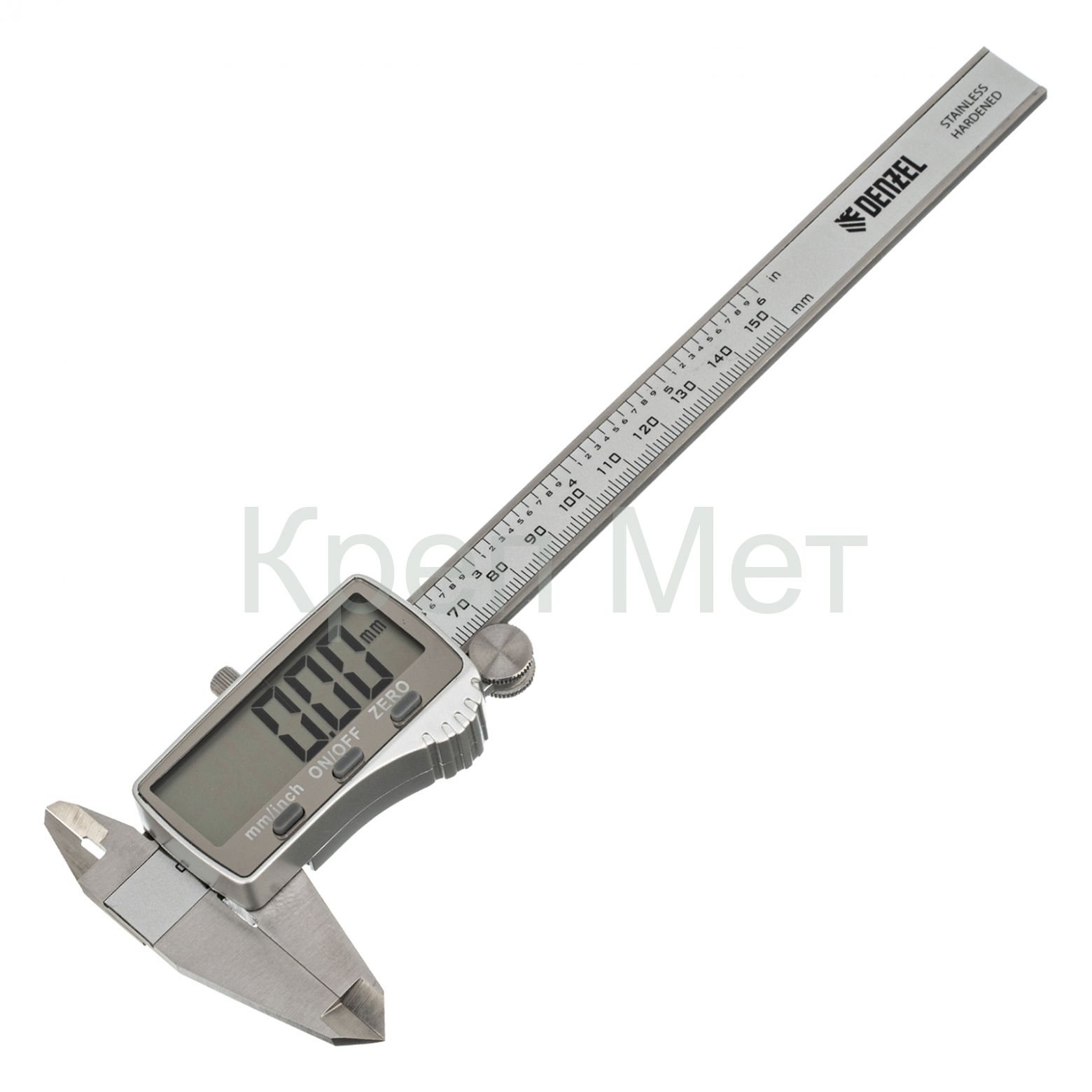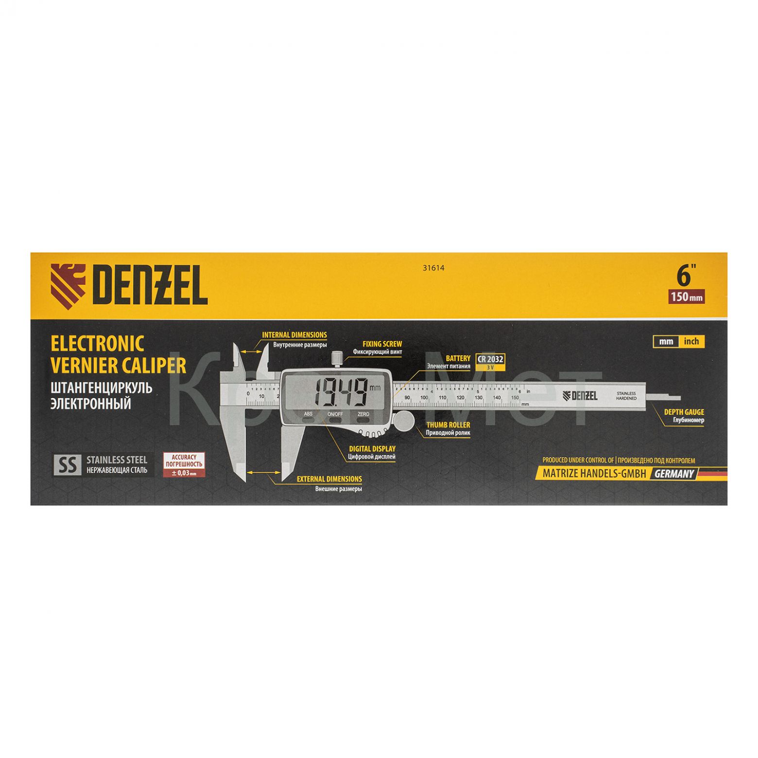 Электронный штангенциркуль Denzel 31614 со шкалой длиной 150 мм, с большим дисплеем и глубиномером, позволяет определять внутренние и внешние размеры различных деталей. Цена деления составляет 0,01 мм. Штангенциркуль позволяет получать результаты высокой точности: погрешность составляет ±0,02 мм при измерении размеров до 100 мм, и ±0,03 мм — до 150 мм. Двустороннее положение губок облегчает проведение работ. Инструмент пригодится на производстве, в мастерской, гараже, а также будет полезен в быту.