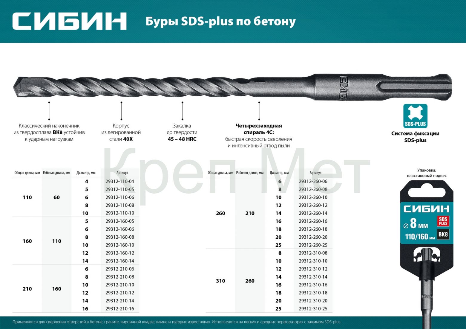 Буры СИБИН по бетону это надежный и проверенный инструмент в быту и строительстве, рассчитанный на использование на средних и тяжелых перфораторах ударного действия с зажимом SDS-plus.