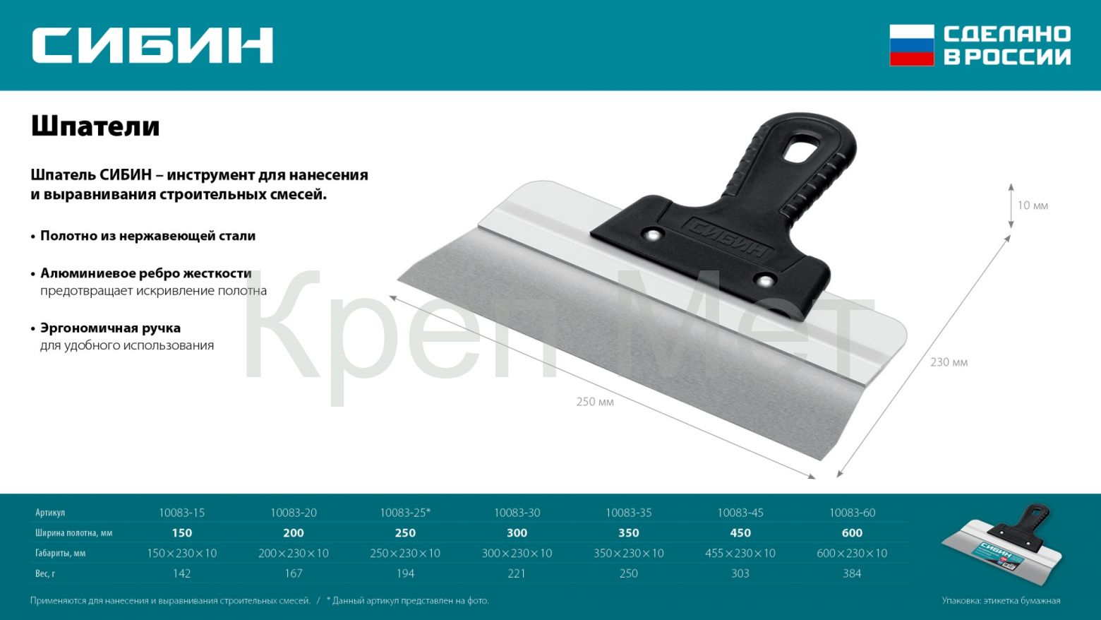 Шпатель СИБИН - отличный выбор для строительства и ремонта! Полотно из нержавеющей стали обеспечивает надежность и долгий срок службы инструмента, алюминиевая направляющая предотвращает изгиб полотна, а эргономичная однокомпонентная рукоятка создает условия для комфортной работы.
