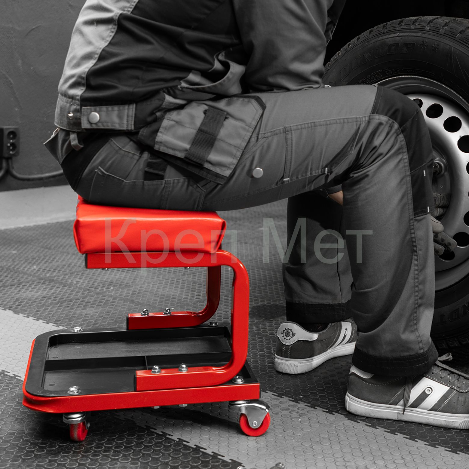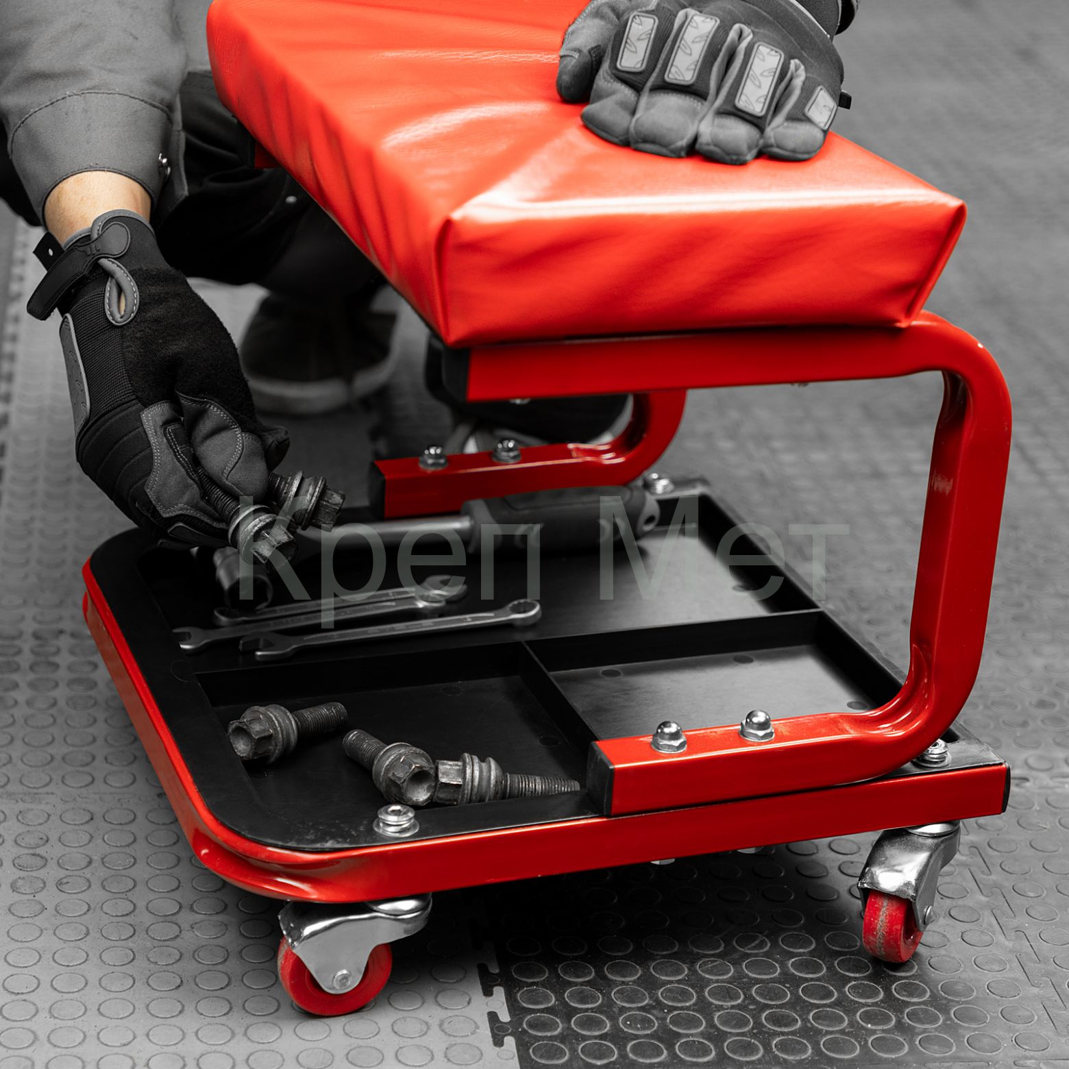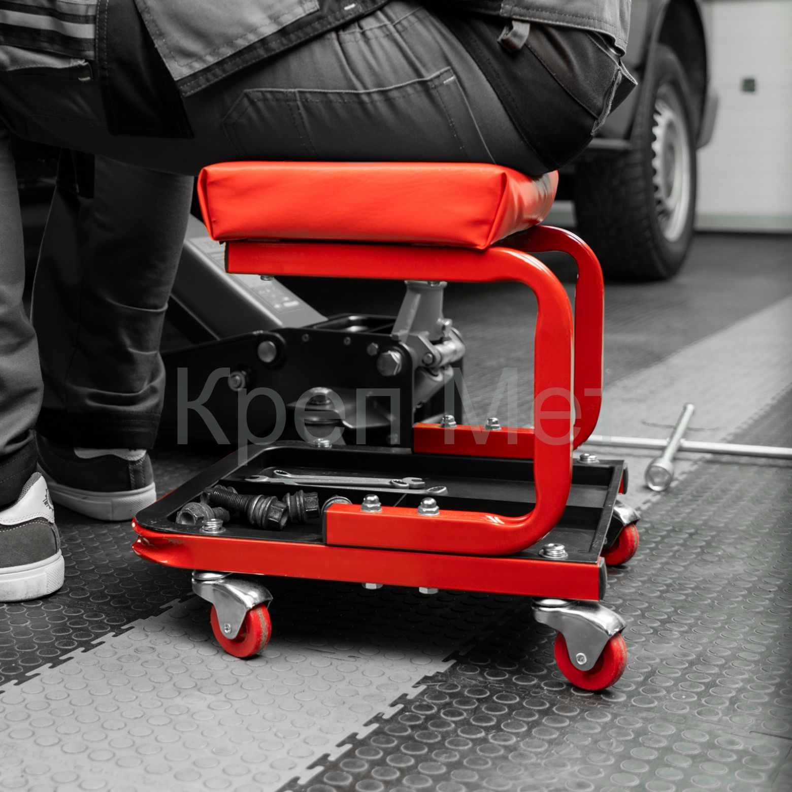 - На сиденье предусмотрены 4 колеса с углом поворота на 360°, поэтому можно с удобством перемещаться по гаражу.