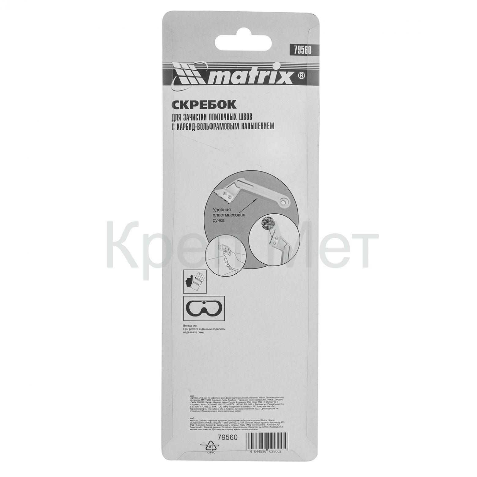 Скребок по кафелю Matrix 79560 длиной 250 мм, с вольфрам-карбидным напылением, используется для затирки швов между плитками, удаления и выравнивания герметика и силикона, а также для снятия обоев и старой краски. Пригодится для работы с кафелем, стеклом и керамикой, подходит для бытового и профессионального применения.