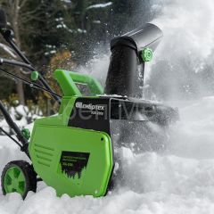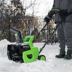 - Удобное хранение и транспортировка — благодаря складной рукоятке снегоуборщик не занимает много места.