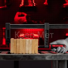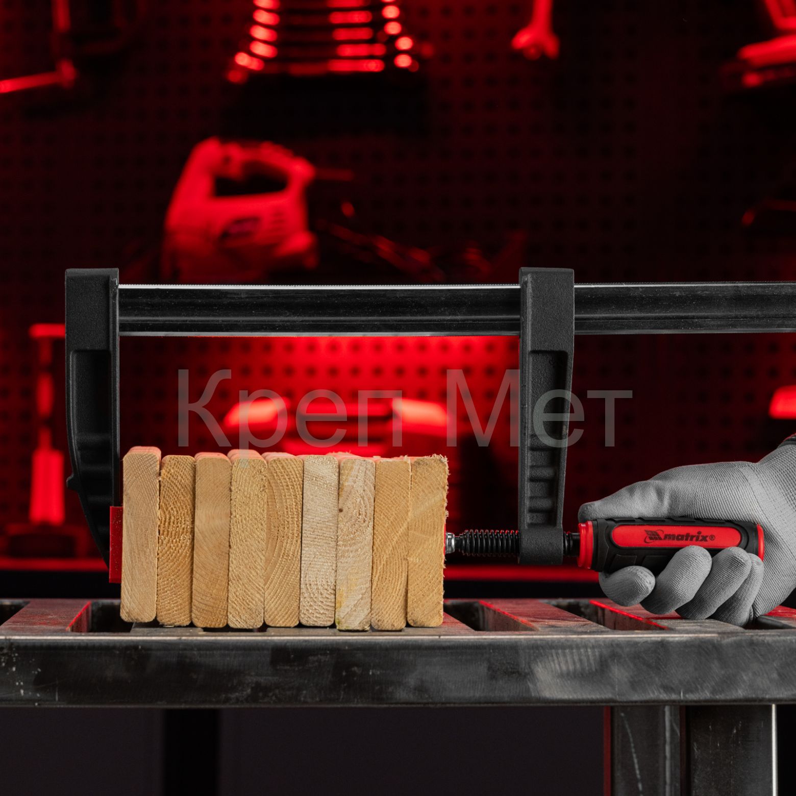 F-образная струбцина Matrix 20408 размером 800 х 120 х 900 мм используется для зажима металлических, деревянных и других заготовок для их последующей обработки или сборки. Представляет собой штангу, на которой установлено 2 кронштейна — неподвижный и подвижный. Деталь помещается между ними и прижимается к губкам при помощи винтового зажима с трапециевидной резьбой. Подвижный кронштейн позволяет регулировать величину захвата, которая может достигать 800 мм. Струбцину применяют для выполнения слесарных и столярных работ.