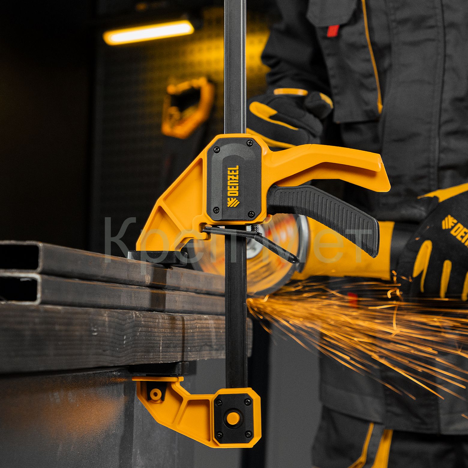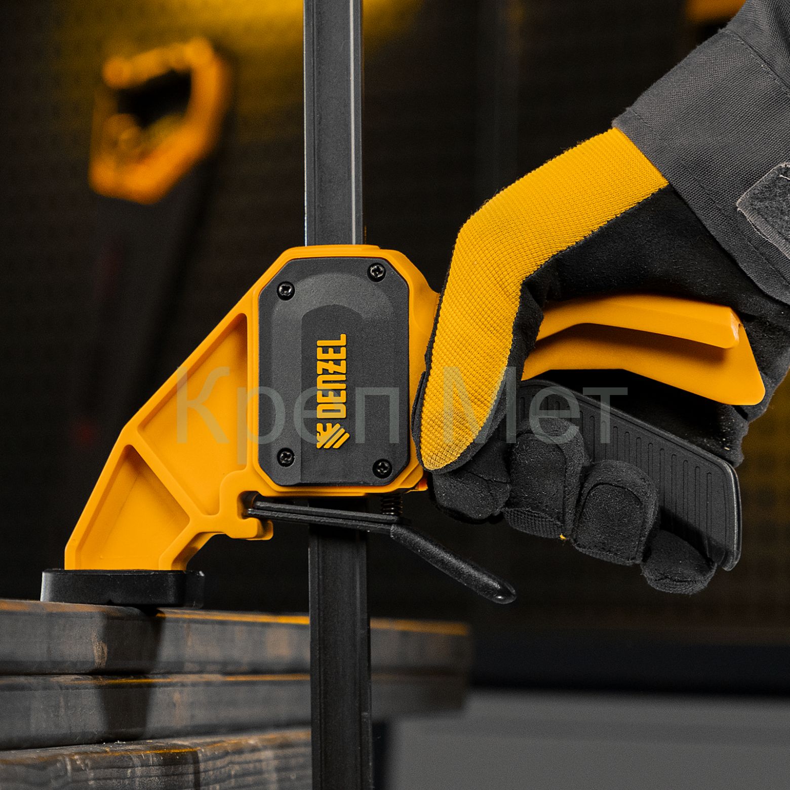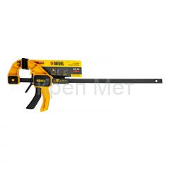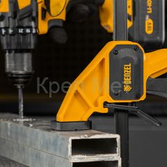 - Комфортное использование — струбцина весит всего 710 г, обрезиненная кнопка фиксации обеспечивает удобный захват.