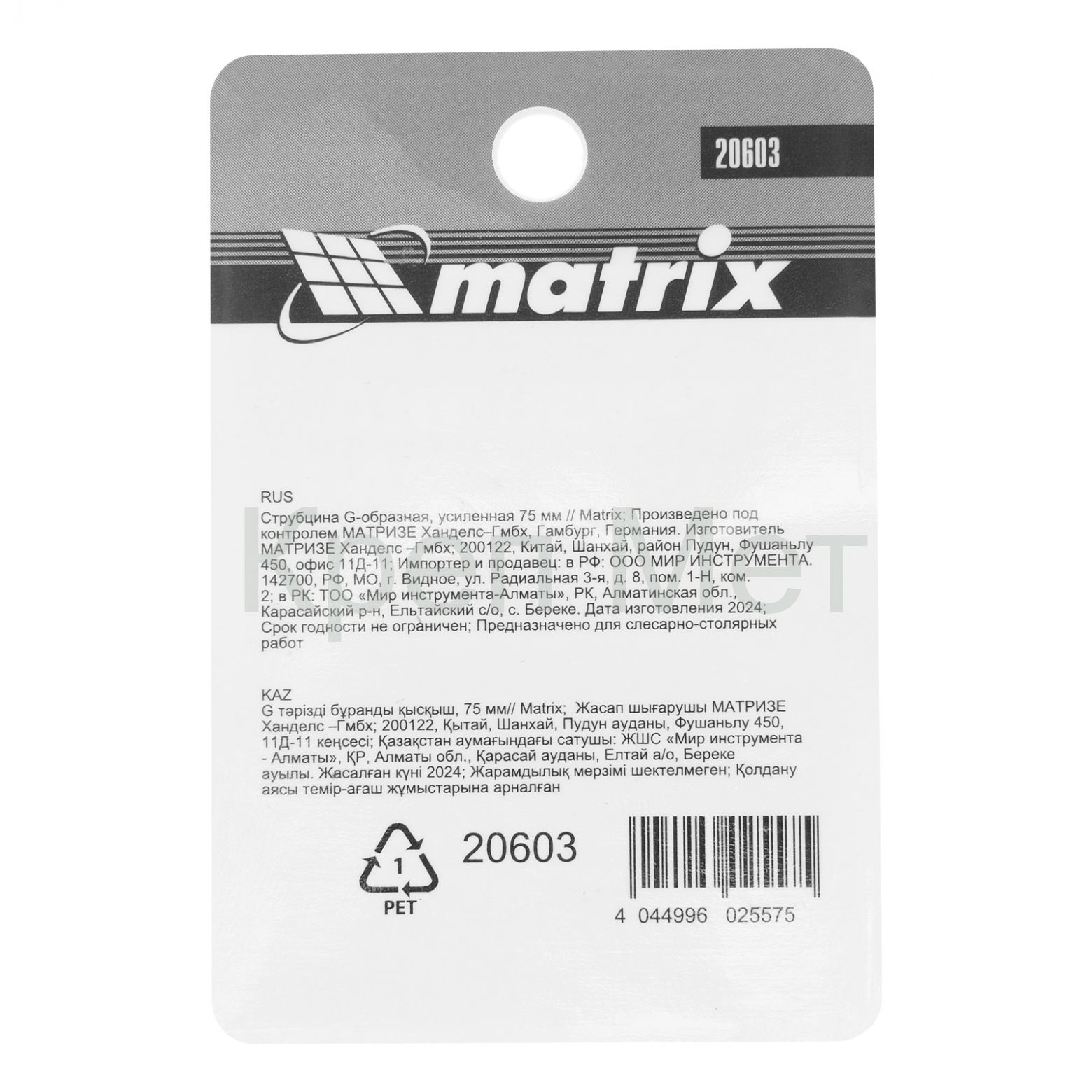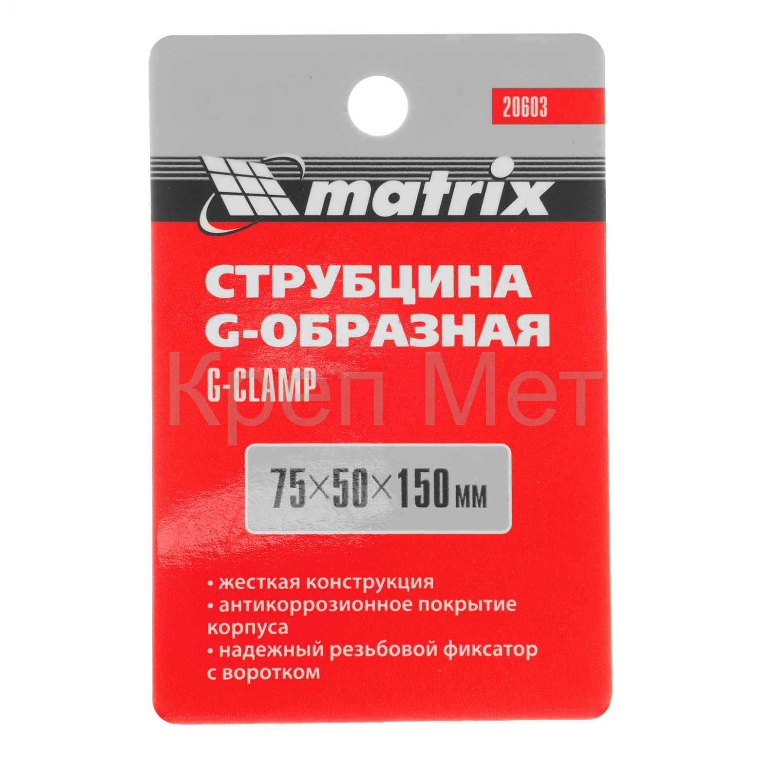 Струбцина G-образная Matrix 20603 с максимальной шириной зажима 75 мм используется для фиксации заготовок или закрепления их на верстаке или станке. Позволяет склеивать детали, а также сверлить их, шлифовать, опиливать и проводить другие работы. Подходит для использования во время сварки. Стальной винт и рама из высокопрочного чугуна выдерживают значительные нагрузки. Винт с трапециевидной резьбой обеспечивает надежную фиксацию предметов. Струбцина применяется в слесарном и столярном деле, а также в домашнем хозяйстве.