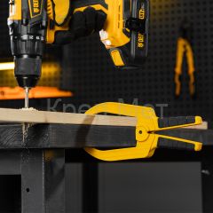 Струбцина клещеобразная удлиненная Denzel 20790 с глубиной зажима 110 мм, с двухкомпонентными рукоятками, способна удерживать детали толщиной до 75 мм. Будет полезна при склеивании или разметке заготовок. Подвижные губки с углублениями на прижимных поверхностях позволяют максимально точно позиционировать деталь при захвате. Струбцина пригодится в столярной мастерской, дома или на даче.