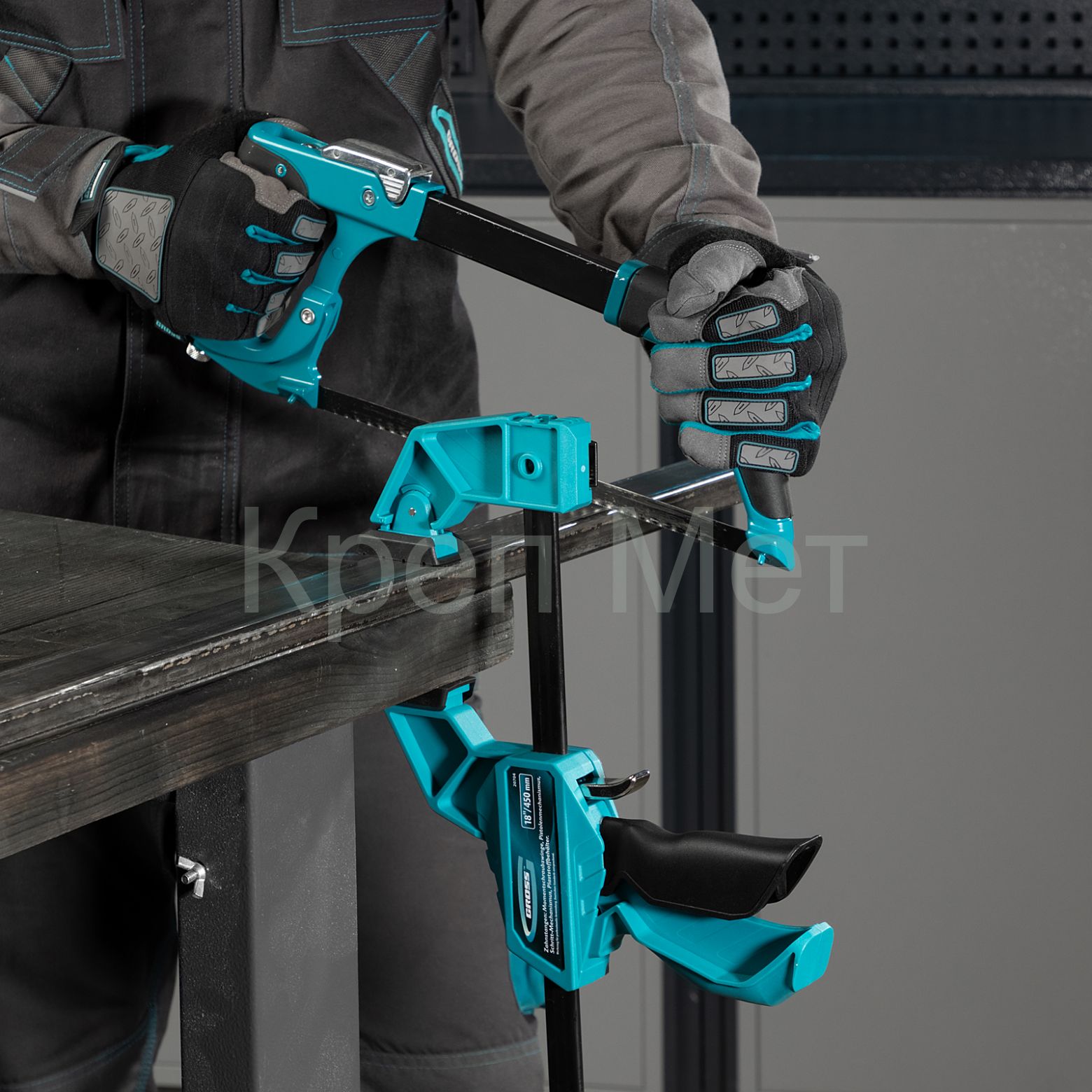 - Устойчивость к высоким нагрузкам — корпус и губки изготовлены из ударопрочного пластика, а шина — из углеродистой стали.